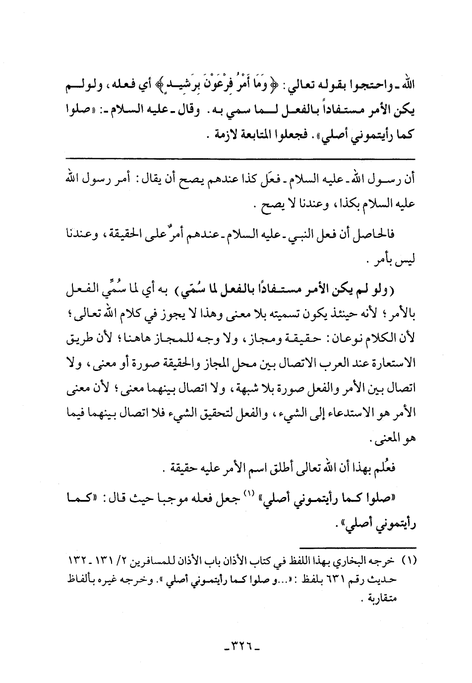 (ولو لم يكن الأمر مستفادًا بالفعل لما سمي) به أي لما سمي الفعل بالأمر؛ لأنه حينئذ يكون تسميته بلا معنى وهذا لا يجوز في كلام الله تعالى؛ لأن الكلام نوعان: حقيقة ومجاز، ولا وجه للمجاز هاهنا؛ لأن طريق الاستعارة عند العرب الاتصال بين محل المجاز والحقيقة صورة أو معنى، ولا اتصال بين الأمر والفعل صورة بلا شبهة، ولا اتصال بينهما معنى؛ لأن معنى الأمر هو الاستدعاء إلى الشيء، والفعل لتحقيق الشيء فلا اتصال بينهما فيما هو المعنى.