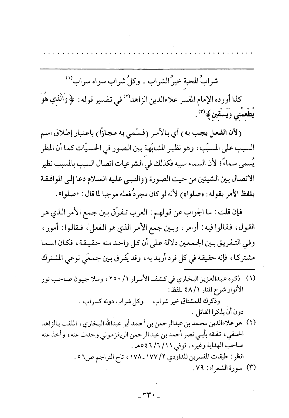 (لأن الفعل يجب به) أي بالأمر (فسمي به مجازًا) باعتبار إطلاق اسم السبب على المسبب، وهو نظير المشابهة بين الصور في الحسيات كما أن المطر يسمى سماءً؛ لأن السماء سببه فكذلك في الشرعيات اتصال السبب بالمسبب نظير الاتصال بين الشيئين من حيث الصورة (والنبي عليه الصلاة والسلام دعا إلى الموافقة بلفظ الأمر بقوله: "صلوا") لأنه لو كان مجرد فعله موجبًا لما قال: "صلوا".