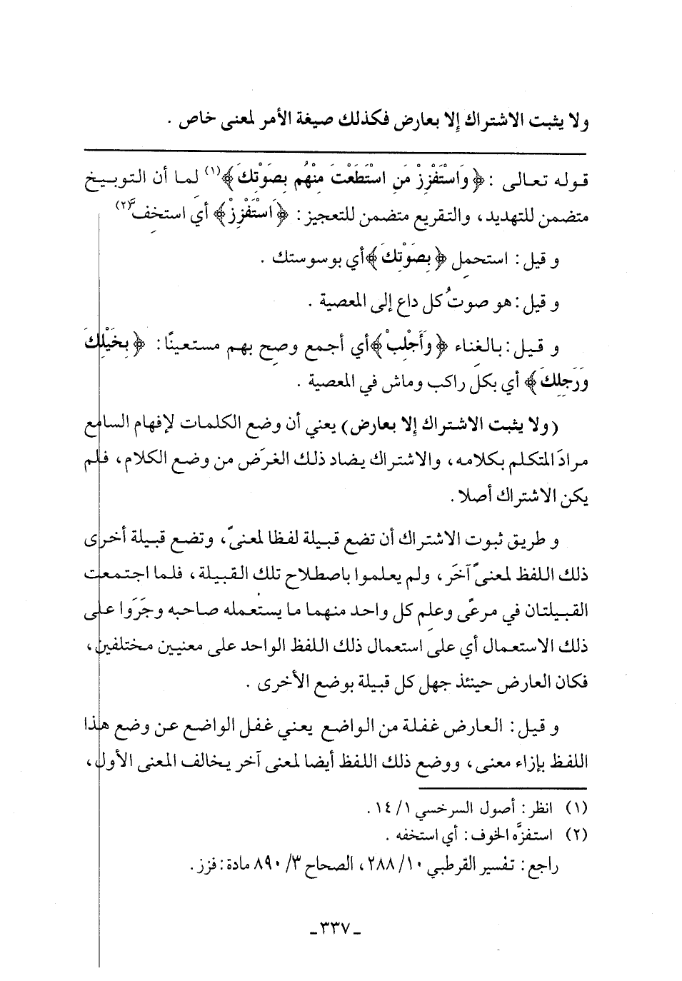 (ولا يثبت الاشتراك إلا بعارض) يعني أن وضع الكلمات لإفهام السامع مراد المتكلم بكلامه، والاشتراك يضاد ذلك الغرض من وضع الكلام، فلم يكن الاشتراك أصلًا.
