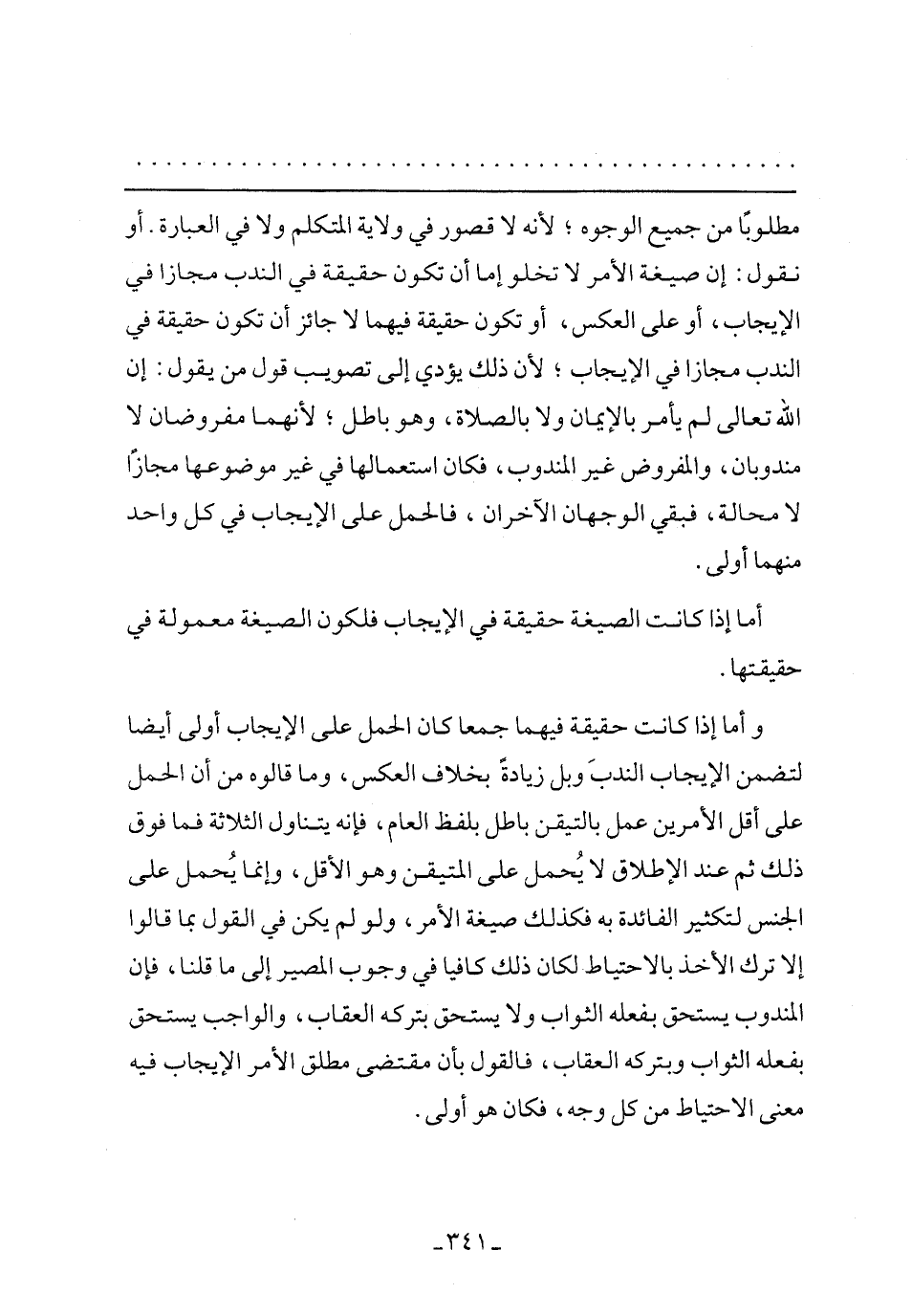 مطلوبًا من جميع الوجوه؛ لأنه لا قصور في ولاية المتكلم ولا في العبارة. أو نقول: إن صيغة الأمر لا تخلو إما أن تكون حقيقة فيهما لا جائز أن تكون حقيقة في الندب مجازًا في الإيجاب؛ لأن ذلك يؤدي إلي تصويب قول من يقول: إن الله تعالى لم يأمر بالإيمان ولا بالصلاة، وهو باطل؛ لأنهما مفروضان لا مندوبان، والمفروض غير المندوب، فكان استعمالها في غير موضوعها مجازًا لا محالة، فبقي الوجهان الآخران، فالحمل علي الإيجاب في كل واحد منهما أولي.