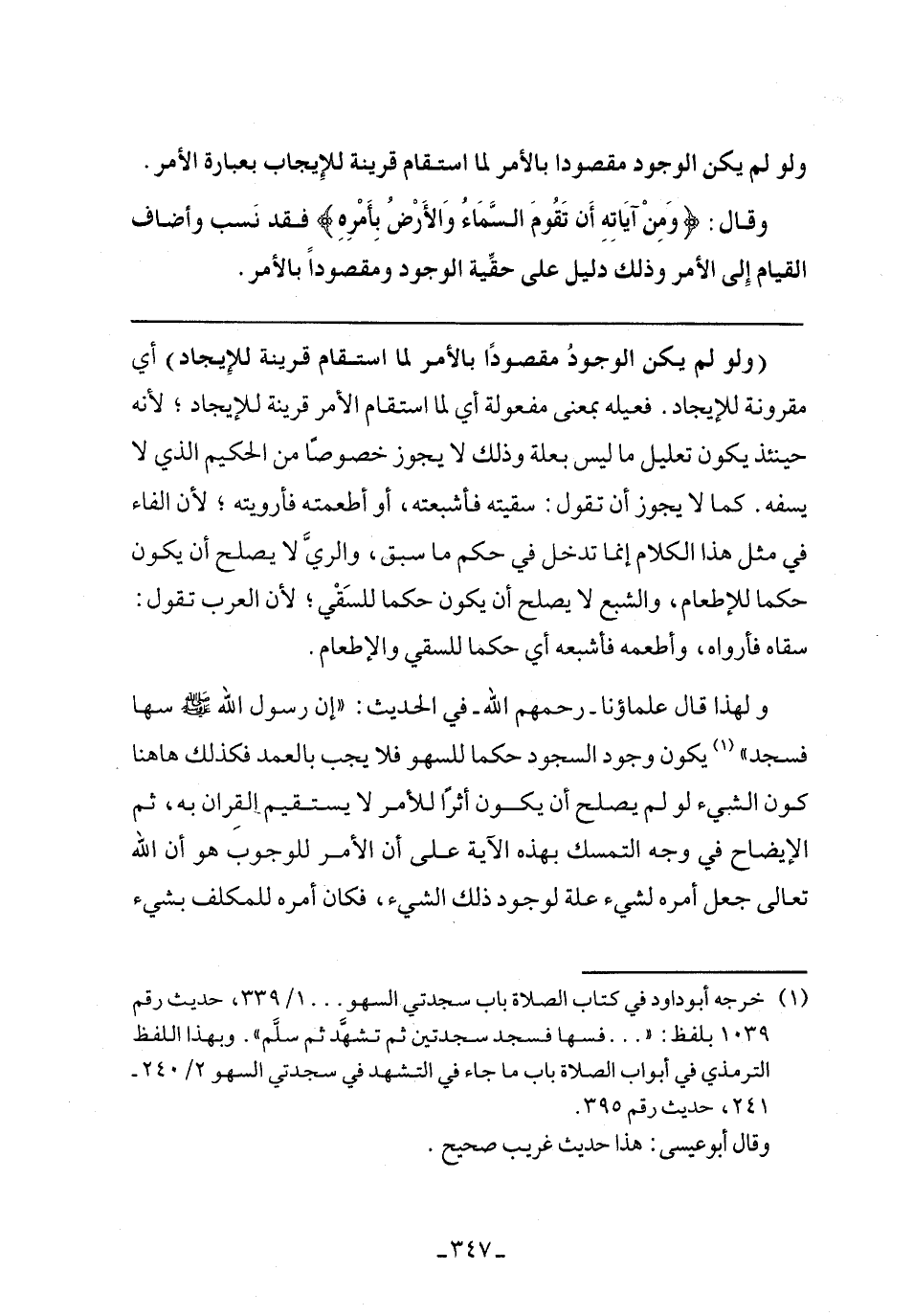 (ولو لم يكن الوجود مقصودًا بالأمر لما استقام قرينة للإيجاد) أي مقرونة للإيجاد. فعيله بمعني مفعولة أي لما استقام الأمر قرينة للإيجاد لأنه حينئذ يكون تعليل ما ليس بعلة وذلك لا يجوز خصوصًا من الحكيم الذي لا يسفه. كما لا يجوز أن تقول: سقيته فأشبعته، أو أطعمته فأرويته؛ لأن الفاء في مثل هذا الكلام إنما تدخل في حكم ما سبق، لأن العرب تقول: سقاه فأرواه، وأطعمه فأشبعه أي حكما للسقي والإطعام. ولهذا قال علماؤنا- رحمهم الله- في الحديث: [إن رسول الله صلي الله عليه وسلم سها فسجد] يكون وجود السجود حكما للسهو فلا يجب بالعمد فكذلك هاهنا كون الشيء لو لم يصلح أن يكون أثرًا للأمر لا يستقيم القران به، ثم الإيضاح في وجه التمسك بهذه الآية علي أن الأمر للوجوب هو أن الله تعالى جعل أمره لشيء علة لوجود ذلك الشيء، فكان أمره للمكلف بشيء
