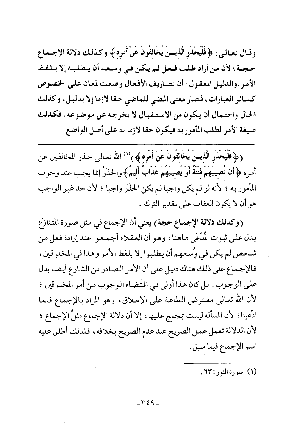 {فَلْيَحْذَرِ الَّذِينَ يُخَالِفُونَ عَنْ أَمْرِهِ} الله تعالى حذر المخالفين عن أمر {أَنْ تُصِيبَهُمْ فِتْنَةٌ أَوْ يُصِيبَهُمْ عَذَابٌ أَلِيمٌ} والحذر إنما يجب عند وجوب المأمور به؛ لأنه لو لم يكن واجبا لم يكن الحذر واجبًا؛ لأن حد غير الواجب هو أن لا يكون العقاب علي تقدير الترك.