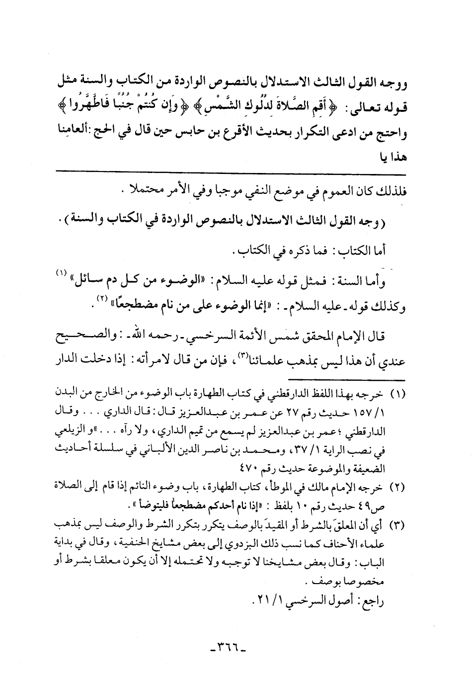 وأما السنة: فمثل قوله عليه السلام: "الوضوء من كل دم سائل" وكذلك قوله- عليه السلام: "إنما الوضوء علي من نام مضطجعًا".