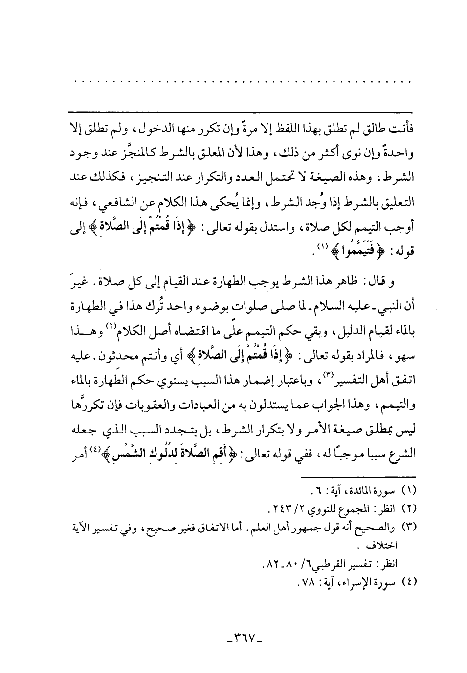 وقال: ظاهر هذا الشرط يوجب الطهارة عند القيام إلي كل صلاة. غير أن النبي- عليه السلام- لما صلي صلوات بوضوء واحد ترك هذا في الطهارة بالماء لقيام الدليل، وبقي حكم التيمم علي ما اقتضاه أصل الكلام وهذا سهو، فالمراد بقوله تعالى: {إذَا قُمْتُمْ إِلَى الصَّلاةِ} أي وأنتم محدثون. عليه اتفق أهل التفسير، وباعتبار إضمار هذا السبب يستوي حكم الطهارة بالماء والتيمم، وهذا الجواب عما يستدلون به من العبادات والعقوبات فإن تكررها ليس بمطلق صيغة الأمر ولا بتكرار الشرط، بل بتجدد السبب الذي جعله الشرع سببا موجبًا له، ففي قوله تعالى: {أَقِمِ الصَّلاةَ لِدُلُوكِ الشَّمْسِ} أمر