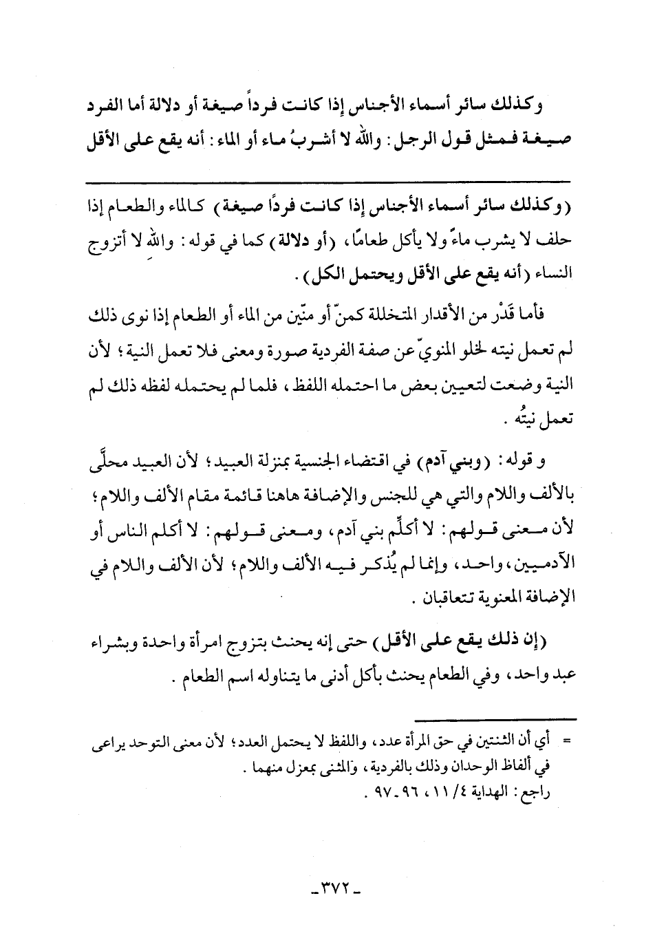 (وكذلك سائر أسماء الأجناس إذا كانت فردًا صيغة) كالماء والطعام إذا حلف لا يشرب ماءً ولا يأكل طعامًا، (أو دلالة) كما في قوله: والله لا أتزوج النساء (أنه يقع علي الأقل ويحتمل الكل).