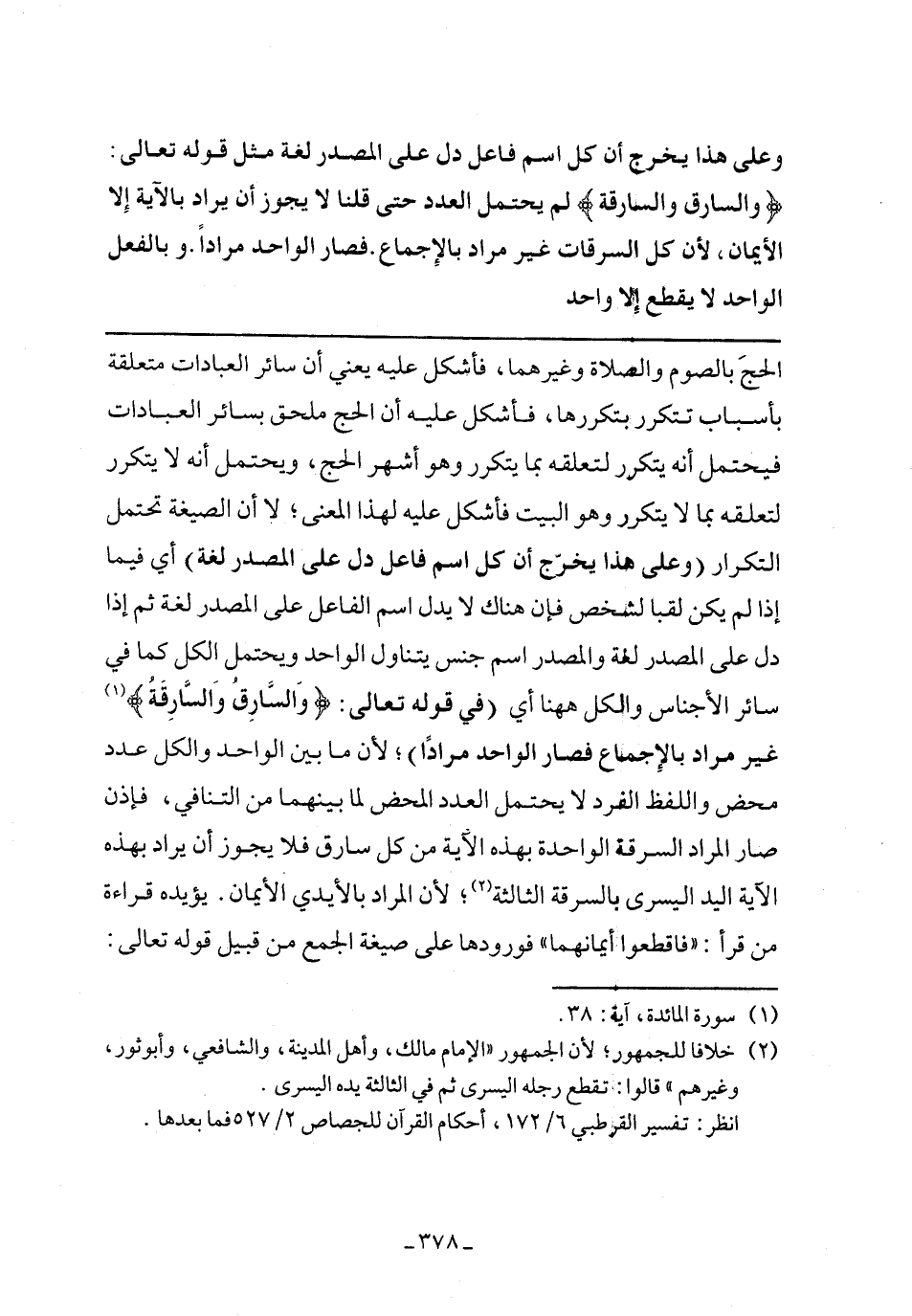 الحج بالصوم والصلاة وغيرهما، فأشكل عليه يعني أن سائر العبادات متعلقة بأسباب تتكرر بتكررها، فأشكل عليه أن الحج ملحق بسائر العبادات فيحتمل أنه يتكرر لتعلقه بما يتكرر وهو أشهر الحج، ويحتمل انه لا يتكرر لتعلقه بما لا يتكرر وهو البيت فأشكل عليه لهذا المعني؛ لا أن الصيغة تحتمل التكرار (وعلي هذا يخرج أن كل اسم فاعل دل علي المصدر لغة) أي فيما إذا لم يكن لقبًا لشخص فغن هناك لا يدل اسم الفاعل علي المصدر اسم جنس يتناول الواحد ويحتمل الكل كما في سائر الأجناس والكل هاهنا أي (في قوله تعالى: {وَالسَّارِقُ وَالسَّارِقَةُ} غير مراد بالإجماع فصار الواحد مرادًا)؛ لأن ما بين الواحد والكل عدد محض واللفظ الفرد لا يحتمل العدد المحض لما بينهما من التنافي، فإذن صار المراد السرقة الواحدة بهذة الآية من كل سارق فلا يجوز أن يراد بهذه الآية اليد اليسري بالسرقة الثالثة؛ لأن المراد بالأيدي الأيمان. يؤيده قراءة من قرأ: "فاقطعوا أيمانهما" فورودها علي صيغة الجمع من قبيل قوله تعالى: