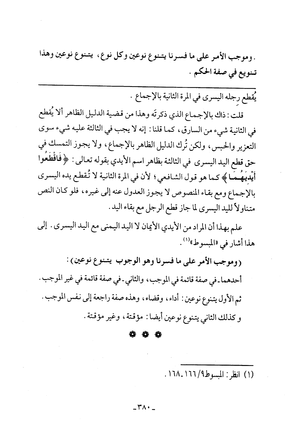 قلت: ذاك بالإجماع الذي ذكرته وهذا من قضية الدليل الظاهر ألا يقطع في الثانية شيء من السارق، كما قلنا: أنه لا يجب في الثالثة بظاهر اسم الأيدي بقوله تعالى: {فَاقْطَعُوا أَيْدِيَهُمَا} كما هو قول الشافعي؛ لأن في المرة الثانية لا تقطع يده اليسري بالإجماع ومع بقاء المنصوص لا يجوز العدول عنه إلي غيره، فلو كان النص متناولًا لليد اليسرى لما جاز قطع الرجل مع بقاء اليد.