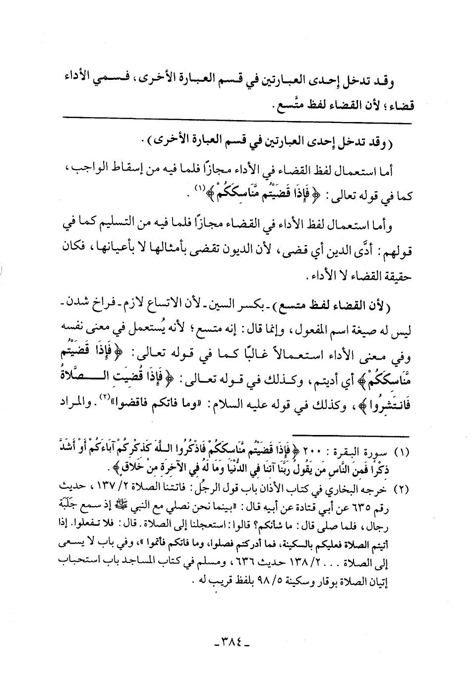 لأن القضاء لفظ متسع) -بكسر السين- لأن الاتساع لازم- فراخ شدن- ليس له صيغة اسم المفعول، وإنما قال: إنه يستعمل في معني نفسه وفي معني اسم المفعول، وإنما قال: إنه متسع؛ لأنه يستعمل في معني نفسه وفي معني الأداء استعمالًا غالبًا كما في قوله تعالى: {فَإِذَا قُضيَتُم مَّنَاسِكَكُمْ} أي أديتم، وكذلك في قوله تعالى: {{فَإِذَا قُضِيَتِ الصَّلاةُ فَانتَشِرُوا}، وكذلك في قوله عليه السلام: "وما فاتكم فاقضوا". والمراد