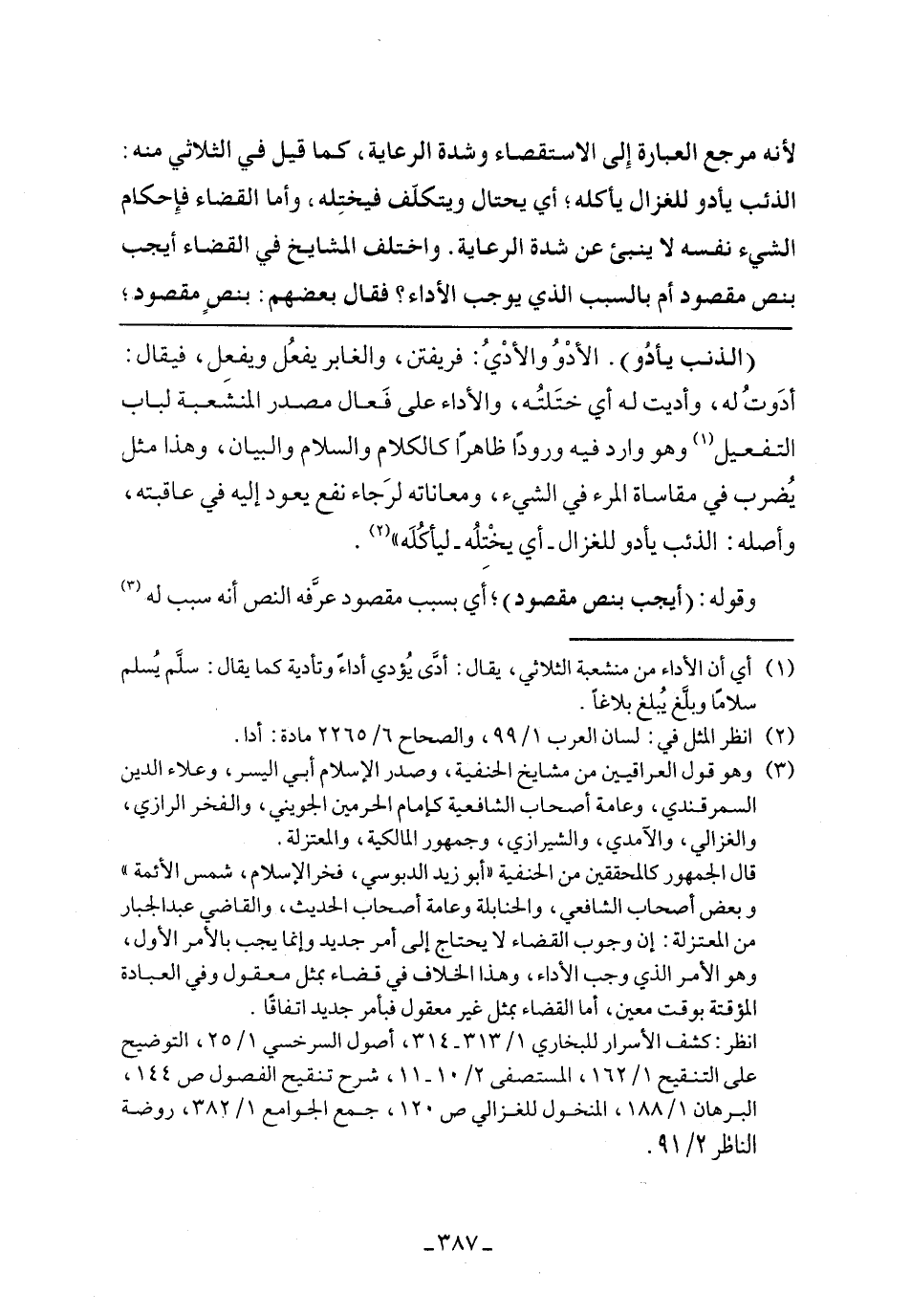 (الذنب يأدو). الأدو والأدي: فريفتن، والغابر يفعل ويفعل، فيقال: أدوات له، وأديت له أي ختلته، والأداء علي فعال مصدر المنشبعة لباب التفعيل وهو وارد فيه ورودًا ظاهرًا كالكلام والسلام والبيان، وهذا مثل يضرب في مقاساة المرء في الشيء، ومعاناته لرجاء نفع يعود إليه في عاقبته، وأصله: الذئب يأدو للغزال- أي يختله- ليأكله"