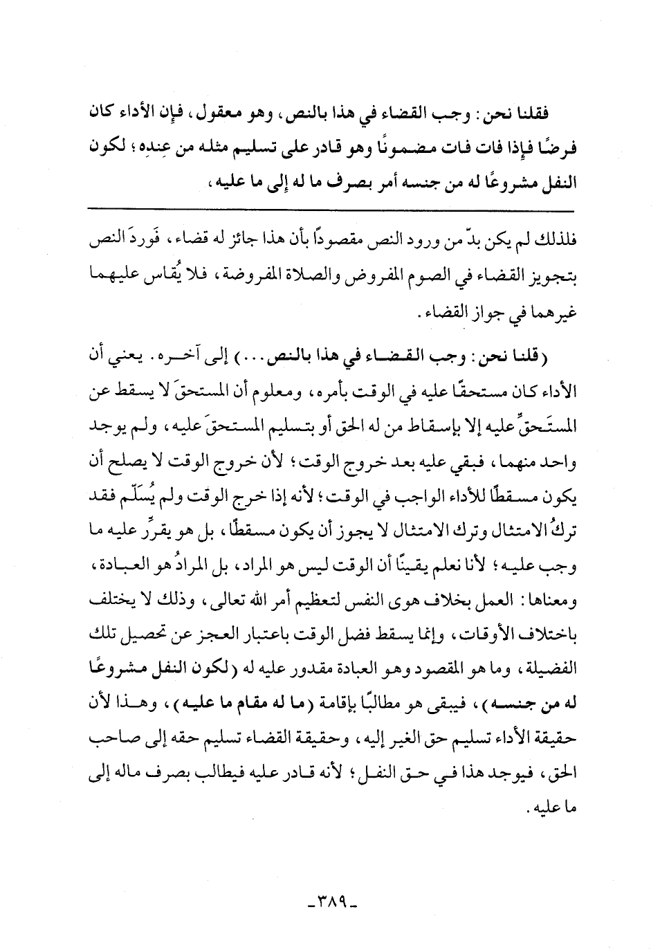 (قلنا نحن: وجب القضاء في هذا بالنص ...) إلى آخره. يعني أن الأداء كان مستحقًا عليه في الوقت بأمره، ومعلوم أن المستحق لا يسقط عن المستحق عليه إلا بإسقاط من له الحق أو بتسليم المستحق عليه، ولم يوجد واحد منهما، فبقى عليه بعد خروج الوقت؛ لأن خرج الوقت ولم يسلم فقد ترك الامتثال وترك الامتثال لا يجوز أن يكون مسقطًا، بل هو يقرر عليه ما وجب عليه؛ لأنا نعلم يقينًا أن الوقت ليس هو المراد، بل المراد هو العبادة، ومعناها: العمل بخلاف هوى النفس لتعظيم أمر الله تعالى، وذلك لا يختلف باختلاف الأوقات، وإنما يسقط فضل الوقت باعتبار العجز عن تحصيل تلك الفضيلة، وما هو المقصود وهو العبادة مقدور عليه له (لكون النفل مشروعًا له من جنسه)، فيبقى هو مطالبًا بإقامة (ما له مقام ما عليه)، وهذا لأن حقيقة الأداء تسليم حق الغير إليه، وحقيقة القضاء تسليم حقه إلى صاحب الحق، فيوجد هذا في حق النقل؛ لأنه قادر عليه فيطالب بصرف ماله إلى ما عليه.
