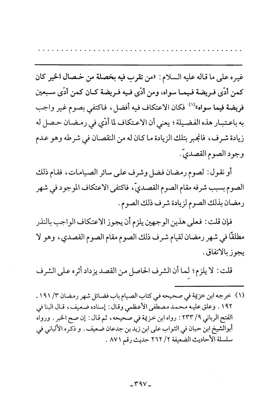 أو نقول: لصوم رمضان فضل وشرف على سائر الصيامات، فقام بذلك الصوم بسبب شرفه مقام الصوم القصدي، فاكتفى الاعتكاف الموجود في شهر رمضان بذلك الصوم لزيادة شرف ذلك الصوم.