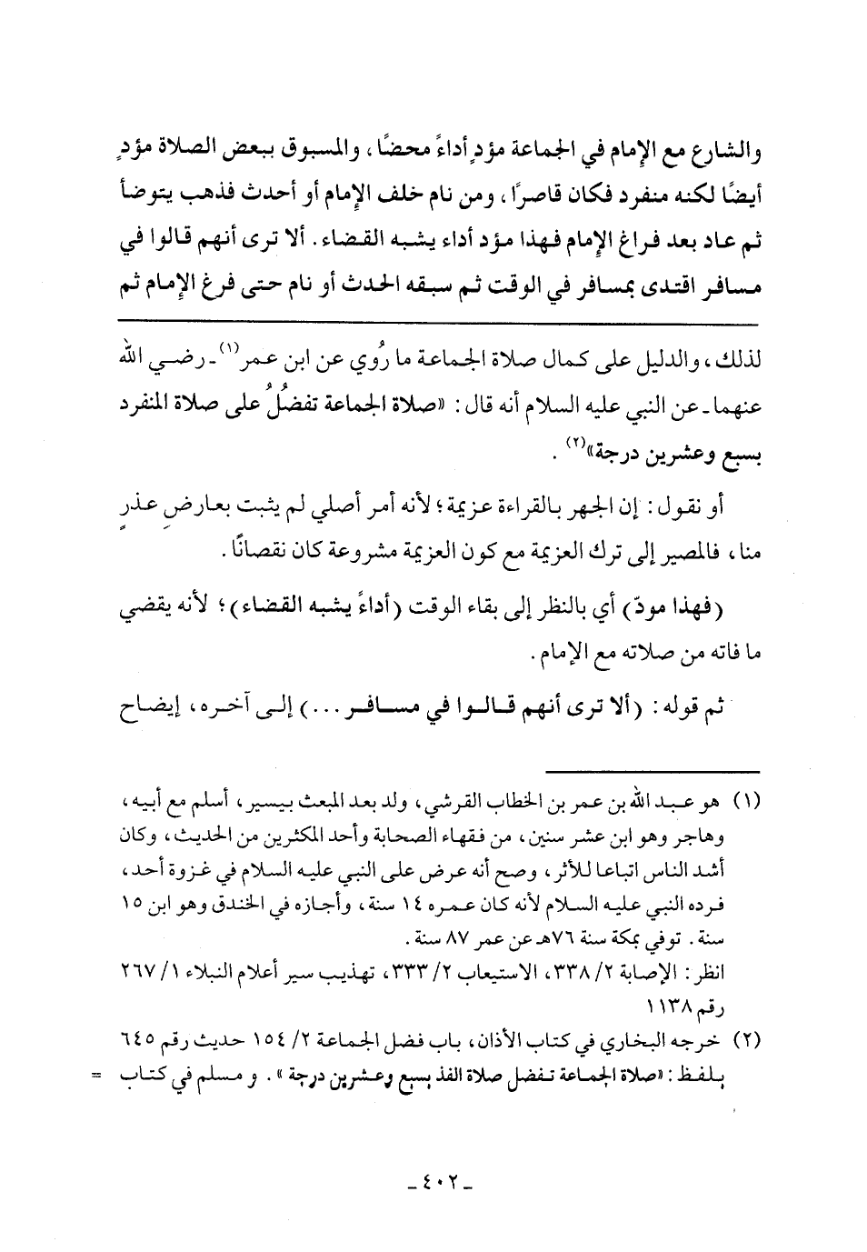 لذلك، والدليل على كمال صلاة الجماعة ما روي عن ابن عمر- رضي الله عنهما- عن النبي عليه السلام أنه قال: ((صلاة الجماعة تفضل على صلاة المنفرد بسبع وعشرين درجة)).
