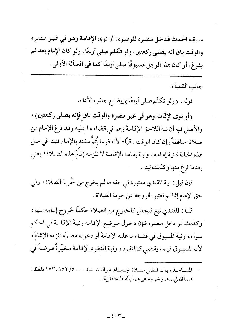 (أو نوى الإقامة وهو في غير مصره والوقت باق فإنه يصلي ركعتين)، والأصل فيه أن نية اللاحق الإقامة وهو في قضاء ما عليه وقد فرغ الإمام من صلاته ساقطة وإن كان الوقت باقيًا؛ لأنه فيما يتم مقتد بالإمام فنيته في مثل هذه الحالة كنية إمامه، ونية إمامه الإقامة لا تلزمه إتمام هذه الصلاة؛ يعني بعدما فرغ منها وكذلك نيته.