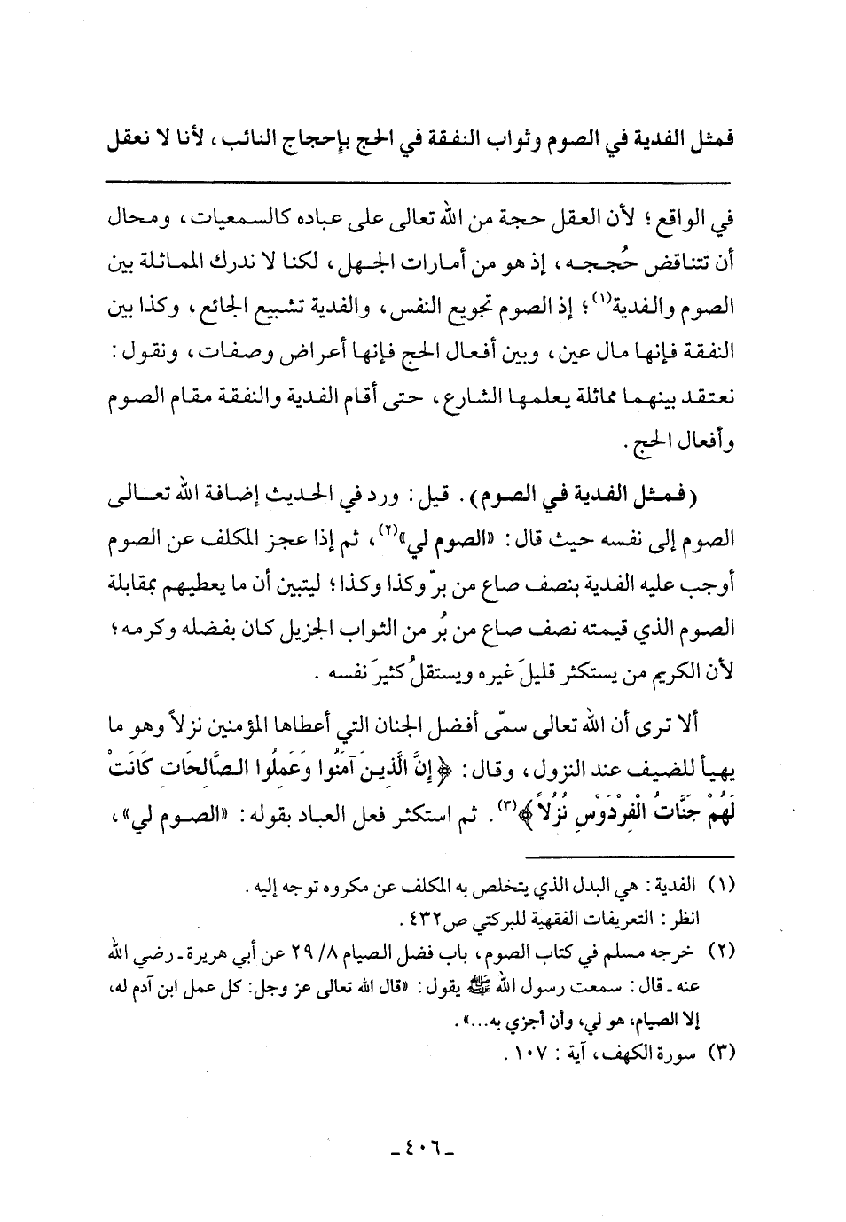 (فمثل الفدية في الصوم). قيل: ورد في الحديث إضافة الله تعالى الصوم إلى نفسه حيث قال: ((الصوم لي))، ثم إذا عجز المكلف عن الصوم أوجب عليه الفدية بنصف صاع من بر وكذا وكذا؛ ليتبين أن ما يعطيهم بمقابلة الصوم الذي قيمته نصف صاع من بر من الثواب الجزيل كان بفضله وكرمه؛ لأن الكريم من يستكثر قليل غيره ويستقل كثير نفسه.