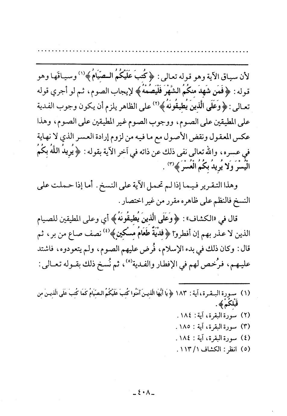 قال في ((الكشاف)): {وَعَلَى الَّذِينَ يُطِيقُونَهُ} أي وعلى المطيقين للصيام الذين لا عذر بهم إن أفطروا {فِدْيَةٌ طَعَامُ مِسْكِينٍ} نصف صاع من بر، ثم قال: وكان ذلك في بدء الإسلام، فرض عليهم الصوم، ولم يتعودوه، فاشتد عليهم، فرخص لهم في الإفطار والفدية، ثم نسخ ذلك بقوله تعالى: