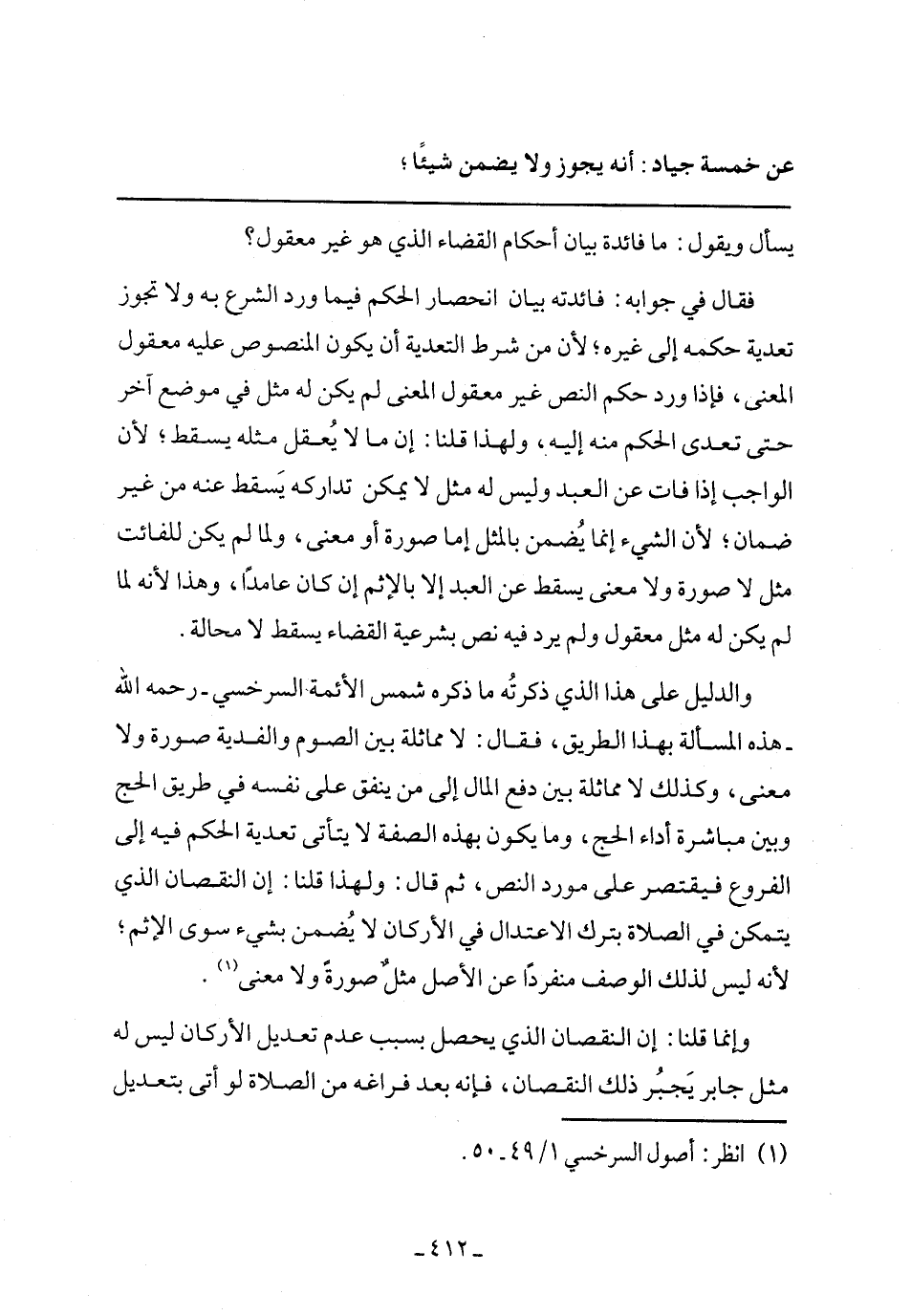 والدليل على هذا الذي ذكرته ما ذكره شمي الأئمة السرسخي- رحمه الله- هذه المسألة بهذا الطريق، فقل: لا مماثلة بين الصوم والفدية صورة ولا معنى، وكذلك لا مماثلة بين دفع المال إلى من ينفق على نفسه في طريق الحج وبين مباشرة أداء الحج، وما يكون بهذه الصفة لا يتأتى تعدية الحكم فيه إلى الفروع فيقتصر على مورد النص، ثم قال: ولهذا قلنا: إن النقصان الذي يتمكن في الصلاة بترك الاعتدال في الأركان لا يضمن بشيء سوى الإثم؛ لأنه ليس لذلك الوصف منفردًا عن الأصل مثل صورة ولا معنى.