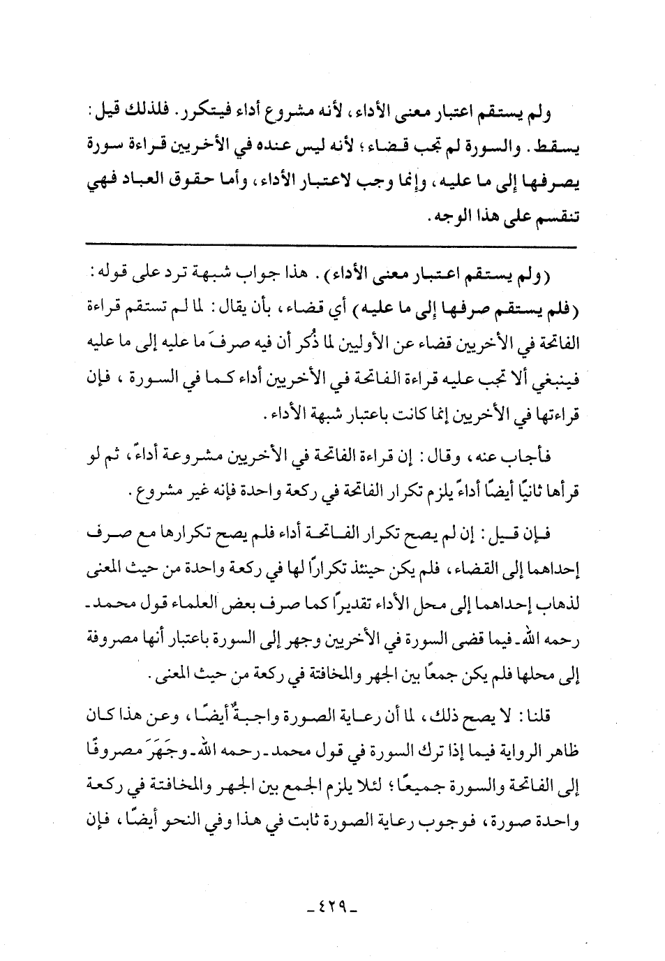 فأجاب عنه، وقال قراءة الفاتحة في الأخريين مشروعة أداء، ثم لو قرأها ثانيًا أيضًا أداء يلزم تكرار الفاتحة في ركعة واحدة فإنه غير مشروع.