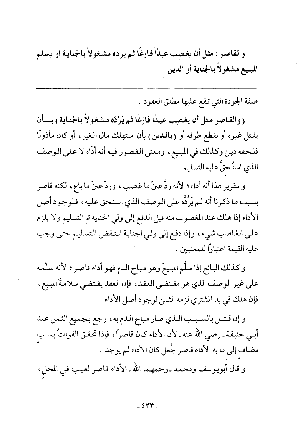 (والقاصر مثل أن يغضب عبدًا فارغًا ثم يرده مشغولًا بالجناية) بان يقتل غيره أو يقطع طرفه أو (بالدين) بأن استهلك مال الغير، أو كان مأذونًا فلحقه دين وكذلك في المبيع، ومعنى القصر فيه أنه أداه لا على الوصف الذي استحق عليه التسليم.