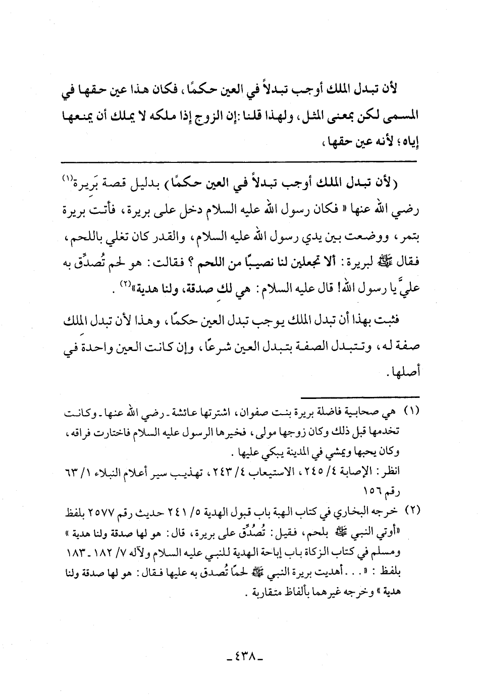 (لأن تبدل الملك أوجب تبدلًا في العين حكمًا) بدليل قصة بريرة رضي الله عنها ((فكار رسول الله عليه السلام دخل على بريرة، فأتت بريرة بتمر، ووضعت بين يدي رسول الله عليه السلام، والقدر كان تلغي باللحم، فقال - صلى الله عليه وسلم - لبريرة: ألا تجعلين لنا نصيبًا من اللحم؟ فقالت: هو لحم تصدق به علي يا رسول الله! قال عليه السلام: هي لك صدقة، ولنا هدية)).