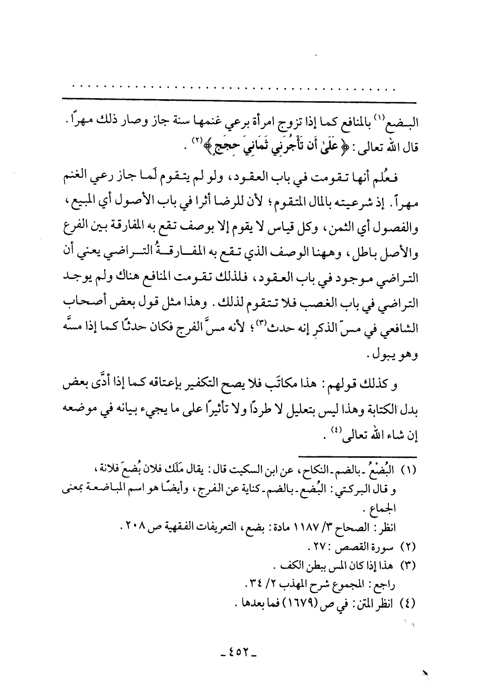البضع بالمنافع كما إذا تزوج امرأة برعي غنمها سنة جاز وصار ذلك مرهًا. قال تعالى: {عَلَى أَنْ تَاجُرَنِي ثَمَانِيَ حِجَجٍ}.