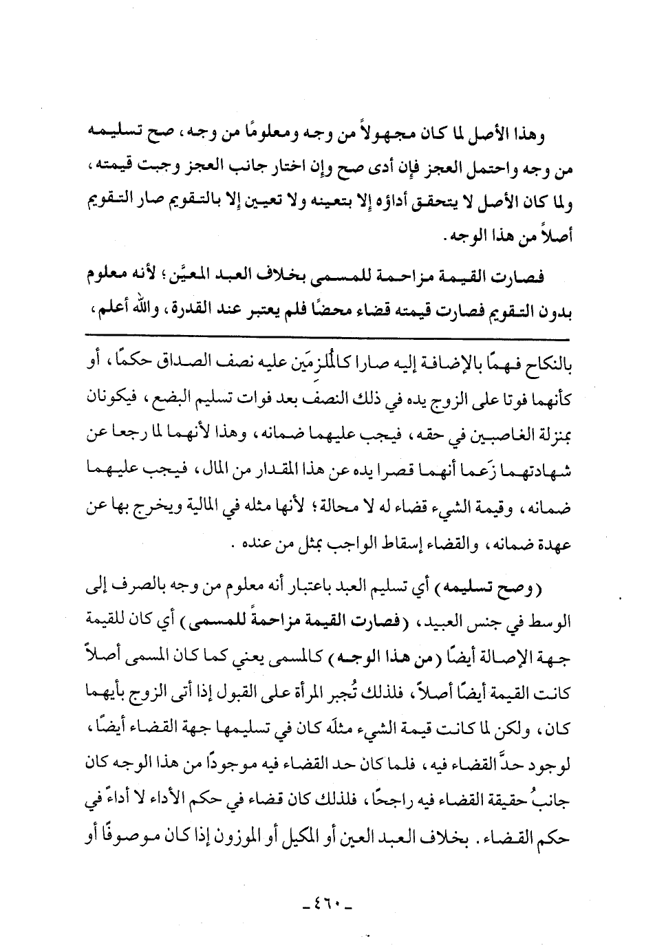 (وصح تسليمه) أي تسليم العبد باعتبار أنه معلوم من وجه بالصرف إلى الوسط في جنس العبيد، (فصارت القيمة مزاحة للمسمى) أي كان للقيمة جهة الإصالة أيضًا (من هذا الوجه) كالمسمى يعني كما كان المسمى أصلًا كانت القيمة أيضًا أصلًا، فلذلك تجبر المرأة على القبول إذا أتى الزوج بأيهما كان، ولكن لما كانت قيمة الشيء مثله كان في تسليمها جهة القضاء أيضًا، لوجود حد القضاء فيه، فلما كان حد القضاء فيه موجودًا من هذا الوجه كان جانب حقيقة القضاء فيه راجحًا، فلذلك كان قضاء في حكم الأداء لا أداء في حكم القضاء. بخلاف العبد العين أو المكيل أو الموزون إذا كان موصوفًا أو