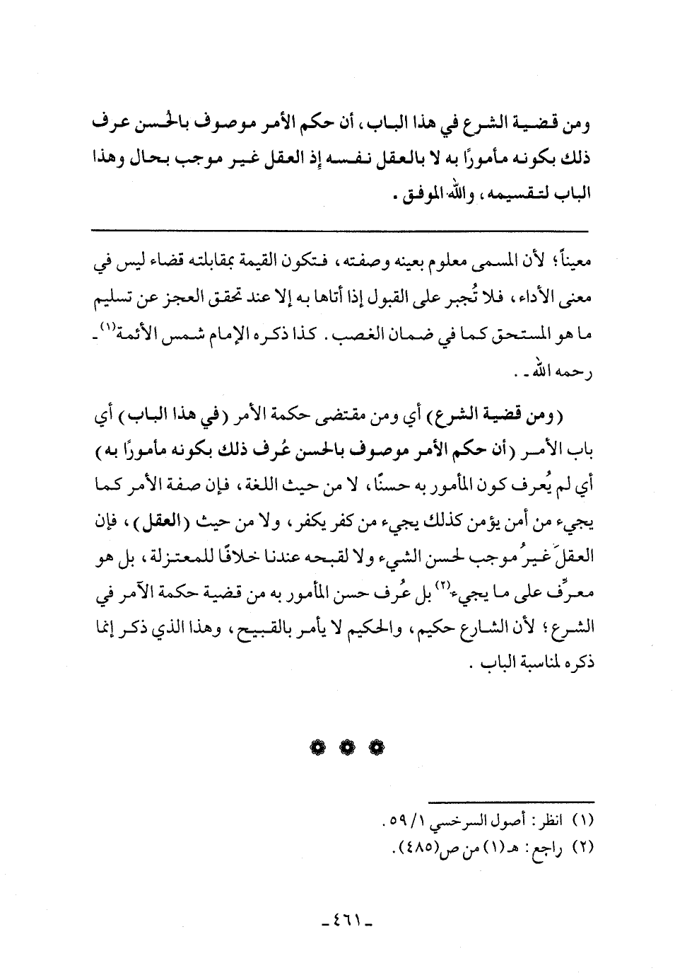 (ومن قضية الشرع) أي ومن مقتضى حكمة الأمر (في هذا الباب) أي باب الأمر (أن حكم الأمر موصوف بالحسن عرف ذلك بكونه مأمورًا به) أي لم يعرف كون المأمور به حسنًا، لا من حيث اللغة، فإن صفة الأمر كما يجيء من أمن يؤمن كذلك يجيء من كفر يكفر، ولا من حيث (العقل)، فإن العقل غير موجب لحسن الشيء ولا لقبحه عندنا خلافًا للمعتزلة، بل هو معرف على ما يجيء بل عرف حين المأمور به من قضية حكمة الآمر في الشرع؛ لأن الشارع حكيم، والحكيم لا يأمر بالقبيح، وهذا الذي ذكر إنما ذكره لمناسبة الباب.