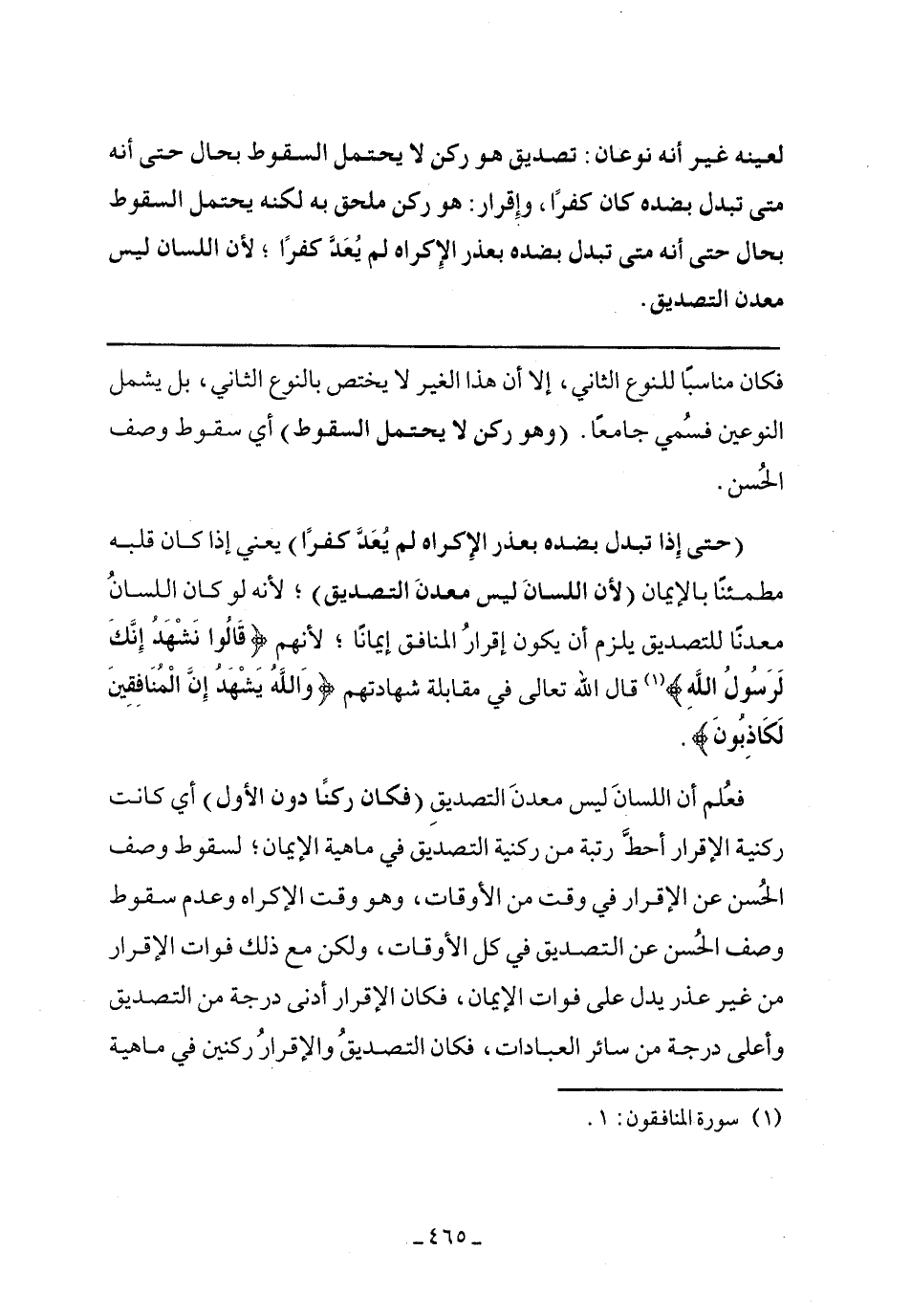 فعلم أن اللسان ليس معدن التصديق (فكان ركنًا دون الأول) أي كانت ركنية الإقرار أحط رتبة من ركنية التصديق في ماهية الإيمان؛ لسقوط وصف الحسن عن الإقرار في وقت من الأوقات، وهو وقت الإكراه وعدم سقوط وصف الحسن عن التصديق في كل الأوقات، ولكن مع ذلك فوات الإقرار من غير عذر يدل على فوات الإيمان، فكان الإقرار أدنى درجة من التصديق وأعلى درجة من سائر العبادات، فكان التصديق والإقرار ركنين في ماهية