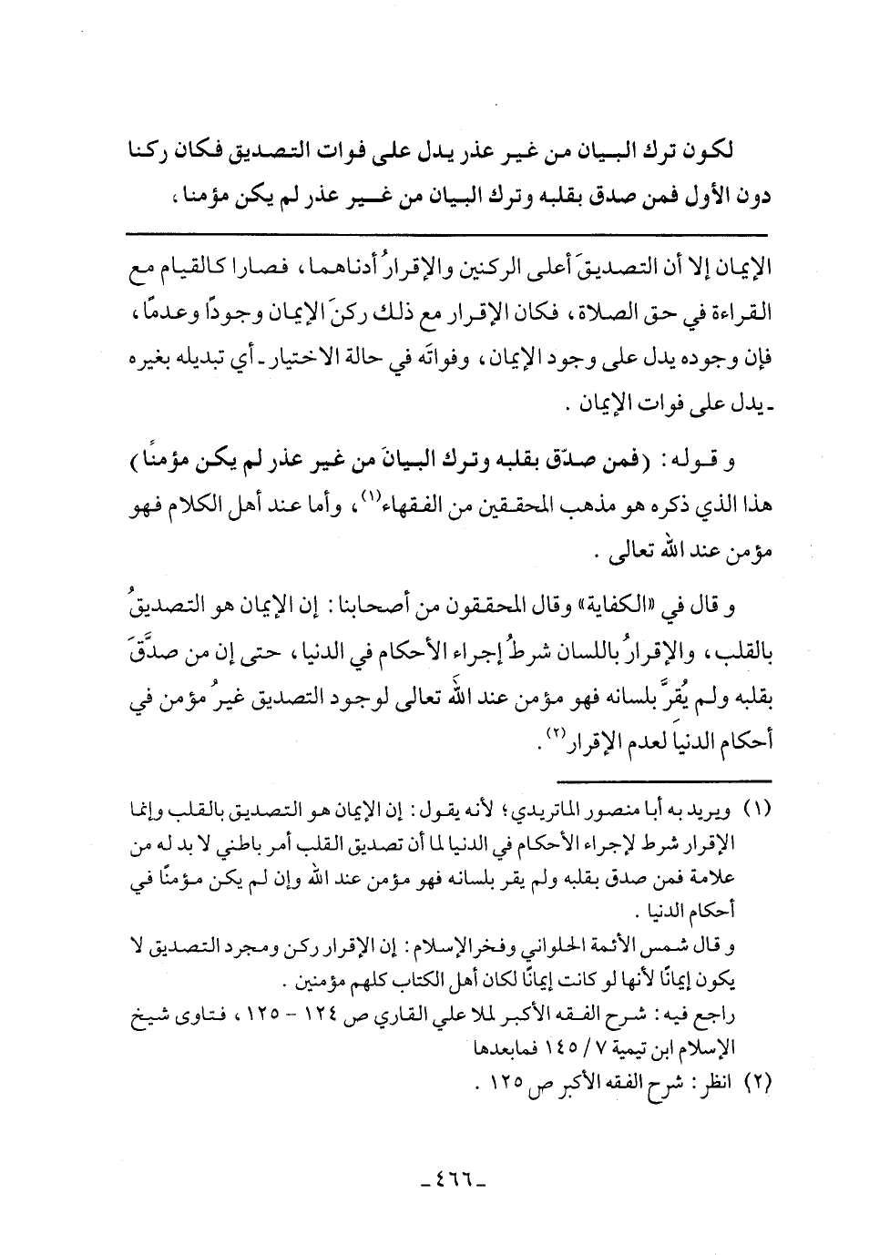 وقوله: (فمن صدق بقلبه وترك البيان من غير عذر لم يكن مؤمنًا) هذا الذي ذكره هو مذهب المحققين من الفقهاء، وأما عند أهل الكلام فهو مؤمن عند الله تعالى.