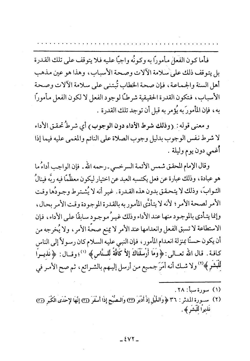 وقال الإمام شمس الأئمة السرخسي -رحمة الله- فإن الواجب أداء ما هو عبادة، وذلك عبارة عن فعل يكتسبه العبد عن اختيار ليكون معظمًا فيه ربه فينال الثواب، وذلك لا يتحقق بدون هذه القدرة. غير أنه لا يشترط وجودها وقت الأمر لصحة الأمر؛ لأنه لا يتأدى المأمور به بالقدرة الموجودة وقت الأمر بحال، وإنما يتأدى بالموجود منها عند الأداء وذلك غير موجود سابقًا على الأداء، فإن الاستطاعة لا تسبق الفعل وانعدامها عند الأمر لا يمنع صحة الأمر، ولا يحرجه من أن يكون حسنًا بمنزلة انعدام المأمور، فإن النبي عليه السلام كان رسولًا إلى الناس افة. قال الله تعالى: (وَمَا أَرْسَلْنَاكَ إِلَّا كَافَّةً لِلنَّاسِ)؛ وقال: (نَذِيرًا لِلْبَشَرِ) ولا شك أنه أمر جميع من أمرسل إليهم بالشرائع، ثم صح الأمر في