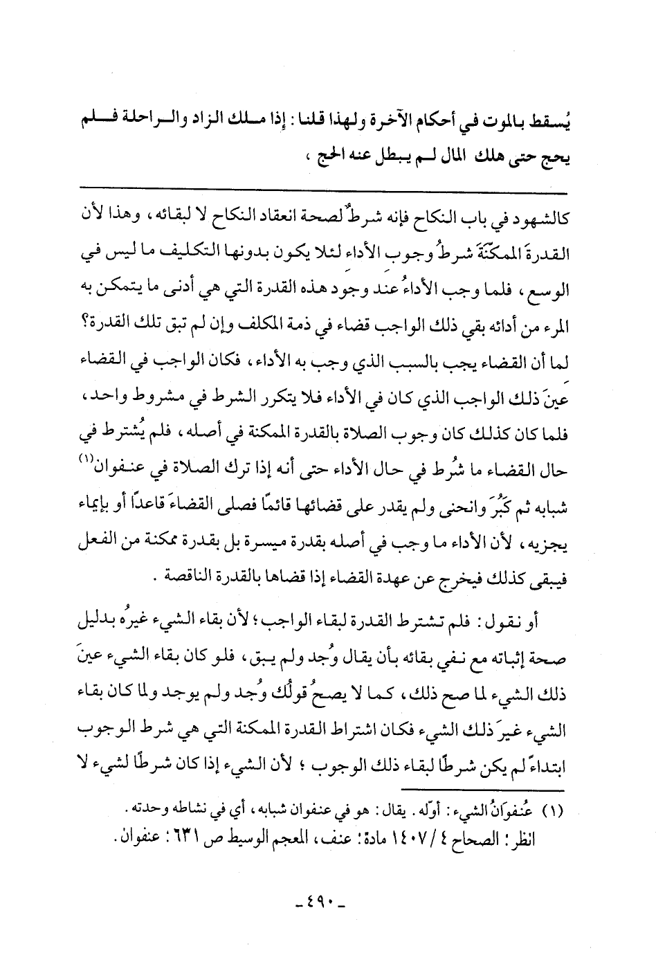 أو نقول: فلم تشترط القدرة لبقاء الواجب؛ لأن بقاء الشيء غيره بدليل صحة إثباته مع نفي بقائه بأن يقال وجد ولم يبق، فلو كان بقاء الشيء عين ذلك الشيء لما صح ذلك، كما لا يصح قولك وجد ولم يوجد ولما كان بقاء الشيء غير ذلك الشيء فكان اشتراط القدرة التي شرط الوجوب ابتداء لم يكن شرطا لبقاء ذلك الوجوب؛ لأن الشيء إذا كان شرطاً لشيء لا