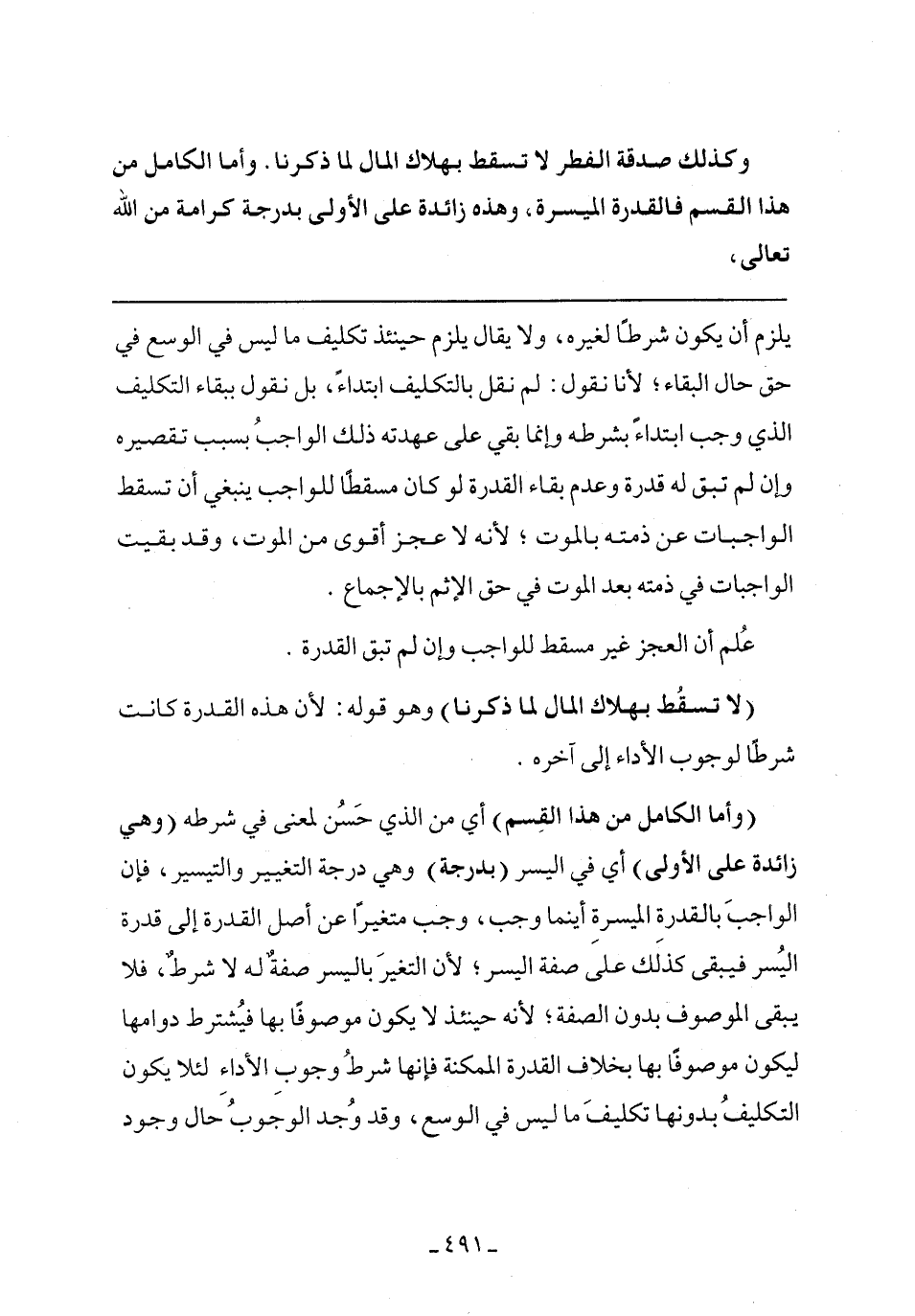(وأما الكامل من هذا القسم) أي من الذي حسن لمعنى في شرطه (وهي زائدة على الأولى) أي في اليسر (بدرجة) وهي درجة التغيير والتيسير، فإن الواجب بالقدرة الميسرة أينما وجب، وجب متغيرا عن أصل القدرة إلى قدرة اليسر فيبقى كذلك على صفة اليسر؛ لأن التغير باليسر صفة له لا شرط، فلا يبقى الموصوف بدون الصفة؛ لأنه حينئذ لا يكون موصوفا بها فيشترط دوامها ليكون موصوفا بها بخلاف القدرة الممكنة فإنها شرط وجوب الأداء لئلا يكون التكليف بدونها تكليف ما ليس في الوسع، وقد وجد الوجوب حال وجود