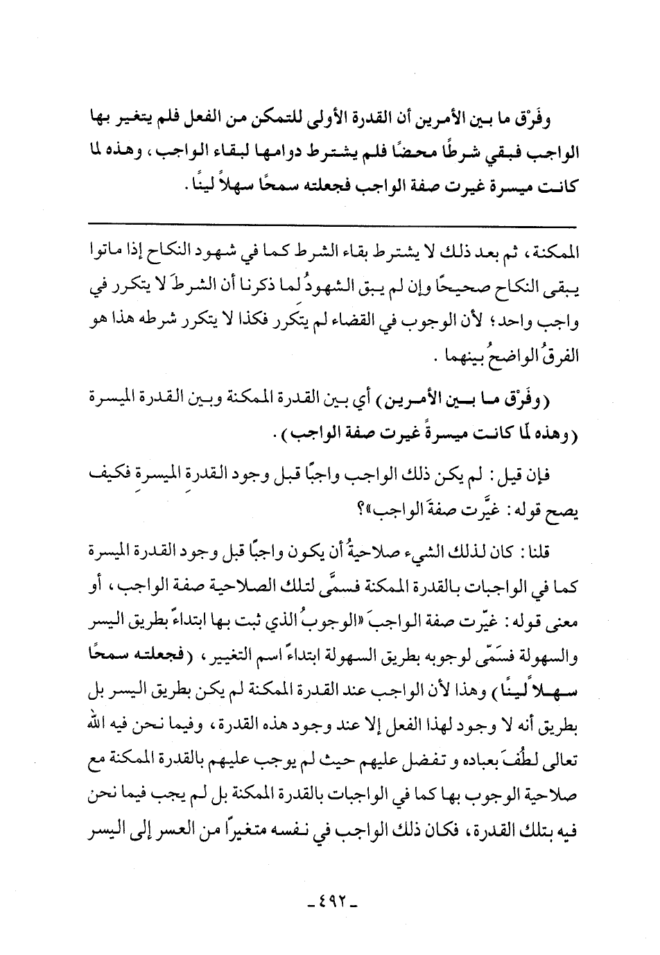 قلنا: كان لذلك الشيء صلاحية أن يكون واجبا قبل وجود القدرة الميسرة كما في الواجبات بالقدرة الممكنة فسمى لتلك الصلاحية صفة الواجب، أو معنى قوله: غيرت صفة الواجب (الوجوب الذي ثبت بها ابتداء بطريق اليسر والسهولة فسمى لوجوبه بطريق السهولة ابتداء اسم التغيير، (فجعلته سمحا سهلا لينا) وهذا لأن الواجب عند القدرة الممكنة لم يكن بطريق اليسر بل بطريق أنه لا وجود لهذا الفعل إلا عند وجود هذه القدرة، وفيما نحن فيه الله تعالى لطف بعباده وتفضل عليهم حيث لم يوجب عليهم بالقدرة الممكنة مع صلاحية الوجوب بها كما في الواجبات بالقدرة الممكنة بل لم يجب فيما نحن فيه بتلك القدرة، فكان ذلك الواجب في نفسه متغيرا من العسر إلى اليسر