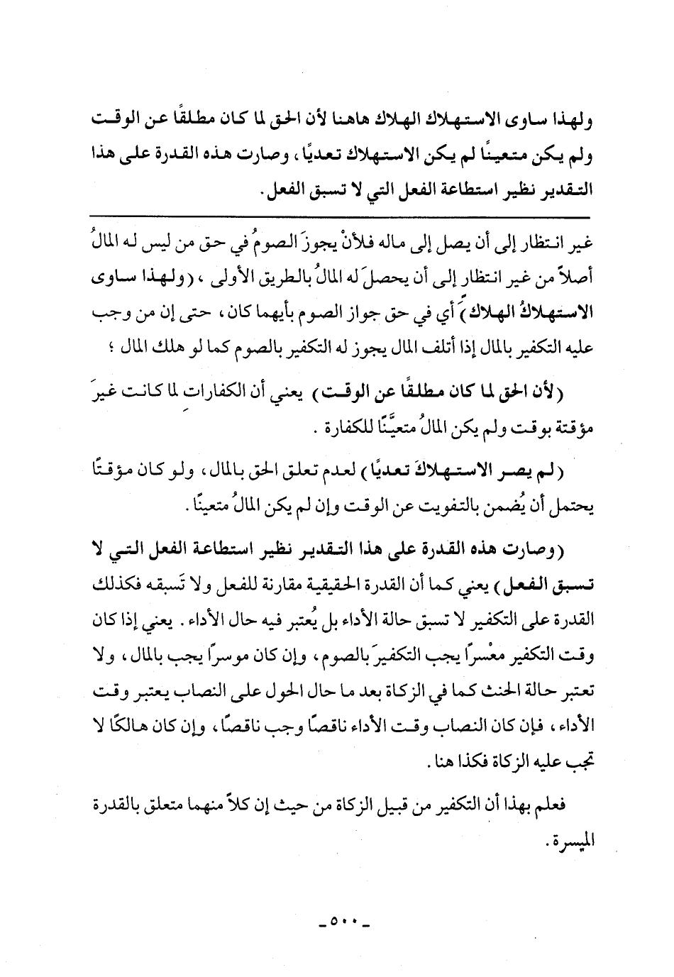 (وصارت هذه القدرة على هذا التقدير نظير استطاعة الفعل التي لا تسبق الفعل) يعني كما أن القدرة الحقيقية مقارنة للفعل ولا تسبقه فكذلك القدرة على التكفير لا تسبق حالة الأداء بل يعتبر فيه حال الأداء. يعني إذا كان وقت التكفير معسرا يجب التكفير بالصوم، وإن كان موسرا يجب بالمال، ولا تعتبر حالة الحنث كما في الزكاة بعد ما حال الحول على النصاب يعتبر وقت الأداء، فإن كان النصاب وقت الأداء ناقصا وجب ناقصا، وإن كان هالكا لا تجب عليه الزكاة فكذا هنا.