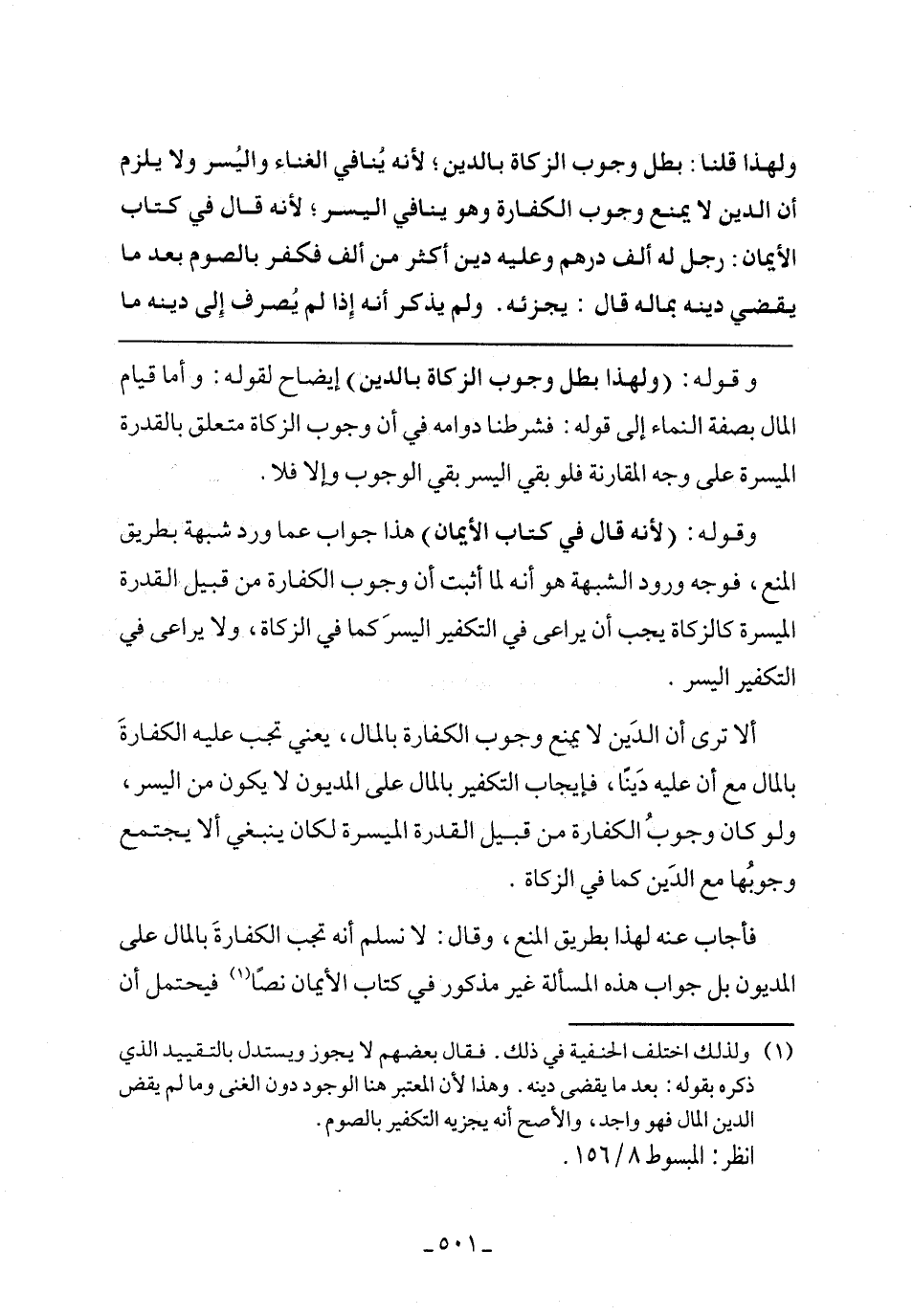 ألا ترى أن الدين لا يمنع وجوب الكفارة بالمال, يعني تجب الكفارة بالمال على المديون بل جواب هذه المسألة غير مذكور في كتاب الأيمان نصًا فيحتمل أن