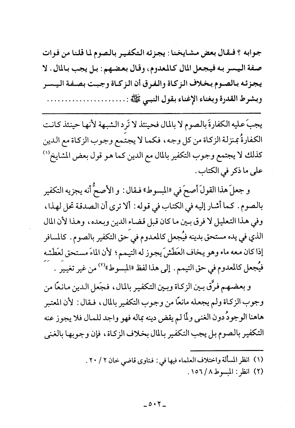 وبعضهم فرَّق بين الزكاة وبين التكفير بالمال, فجَعل الدين مانعًا من وجوب الزكاة ولك يجعله مانعًا من وجوب التكفير بالمال, فقال: لأن المعتبر ها هنا الوجودُ دون الغنى ولمّا لم يقض دينه بماله فهو واجد للمال فلا يجوز عنه التكفير بالصوم بل يجب التكفير بالمال بخلاف الزكاة, فإن وجوبها بالغنى