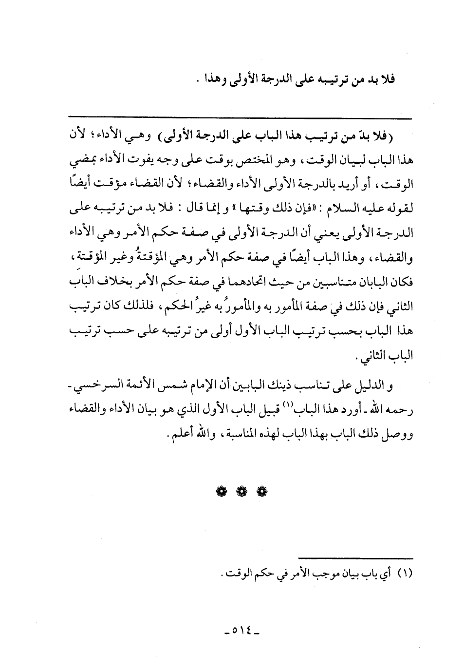 (فلابد من ترتيب هذا الباب على الدرجة الأولى) وهي الأداء؛ لأن هذا الباب لبيان الوقت, وهو المختص بوقت على وجه يفوت الأداء بمضي الوقت, أو أريد بالدرجة الأولى والقضاء؛ لأن القضاء مؤقت أيضًا لقوله عليه السلام: ((فإن ذلك وقتها)) وإنما قال: فلابد من ترتيبه على الدرجة الأولى يعني أن الدرجة الأولى في صفة حكم الأمر وهي الأداء والقضاء, وهذا الباب أيضًا في صفة حكم الأمر وهي المؤقتةُ وغير المؤقتة, فكان البابان متناسبين من حيث اتحادهما في صفة حكم الأمر بخلاف الباب الثاني فإن ذلك في صفة المأمور به والمأمورُ به غيرُ الحكم, فلذلك كان ترتيب هذا الباب بحسب ترتيب الباب الأول أولى من ترتيبه على حسب ترتيب الباب الثاني.