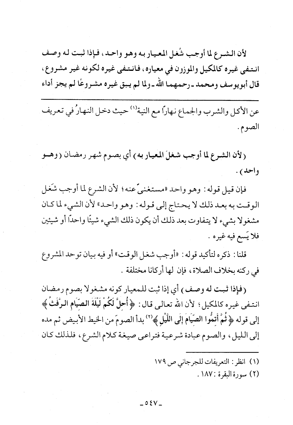 (فإذا ثبت له وصف) أي إذا ثبت للمعيار كونه مشغولًا بصوم رمضان انتفى غيره كالمكيل؛ لأن الله تعالى قال: {أُحِلَّ لَكُمْ لَيْلَةَ الصِّيَامِ الرَّفَثُ} إلى قوله {ثُمَّ أَتِمُّوا الصِّيَامَ إِلَى اللَّيْلِ} بدأ الصوم من الخيط الأبيض ثم مده إلى الليل، والصوم عبادة شرعية فتراعى صيغة كلام الشرع، فلذلك كان
