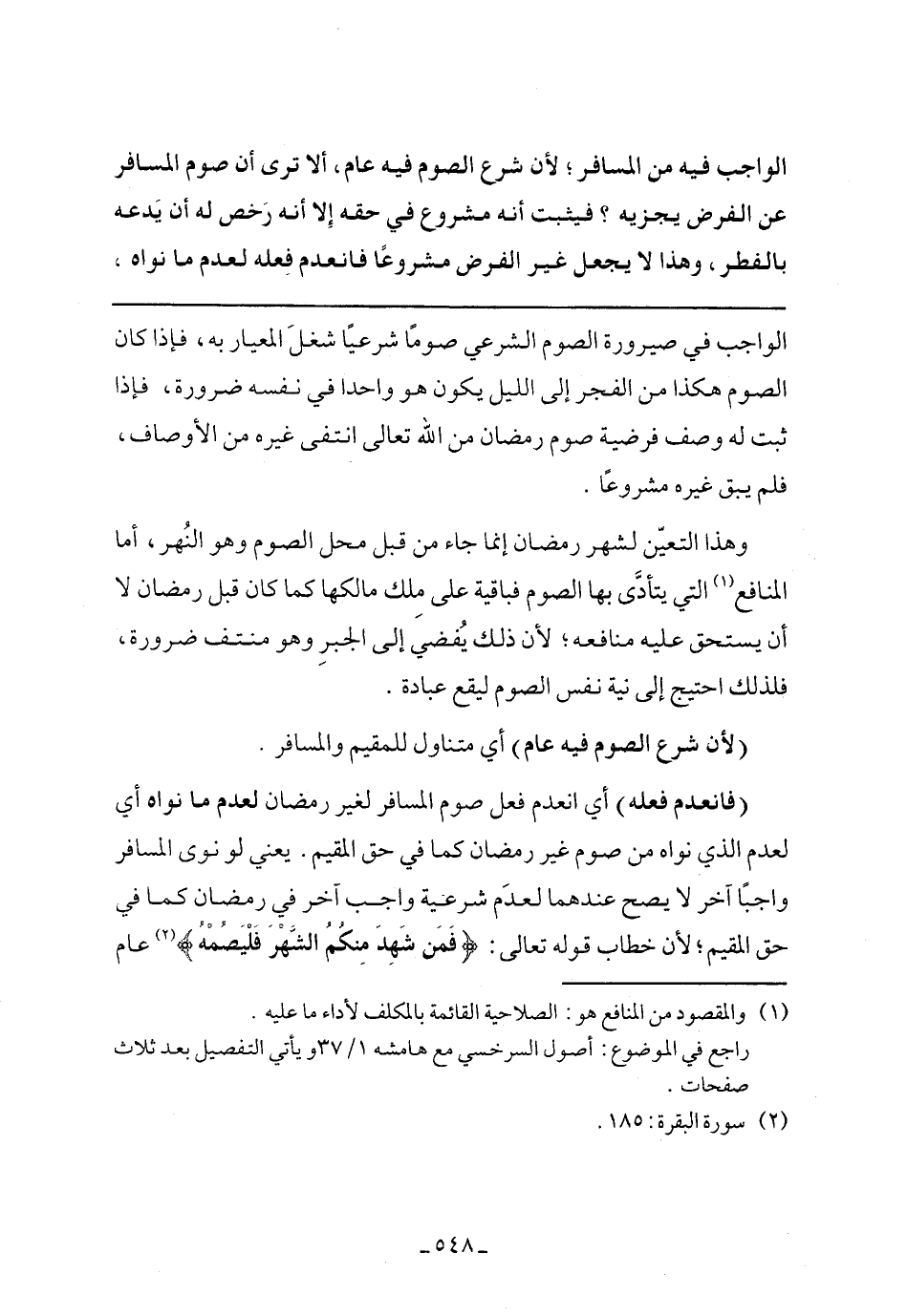 وهذا التعين لشهر رمضان إنما جاء من قبل محل الصوم وهو النهر، أما المنافع التي يتأدى بها الصوم فباقية على ملك مالكها كما كان قبل رمضان لا أن يستحق عليه منافعه؛ لأن ذلك يفضي إلى الجبر وهو منتف ضرورة، فلذلك احتيج إلى نية نفس الصوم ليقع عبادة.