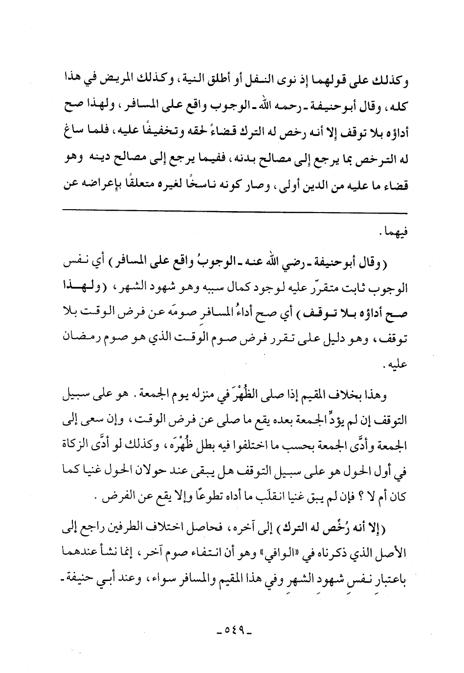 (وقال أبو حنيفة- رضي الله عنه- الوجوب واقع على المسافر) أي نفس الوجوب ثابت متقرر عليه لوجود كمال سببه وهو شهود الشهر، (ولهذا صح أداؤه بلا توقف) أي صح أداء المسافر صومه عن فرض الوقت بلا توقف، وهو دليل على تقرر فرض صوم الوقت الذي هو صوم رمضان عليه.