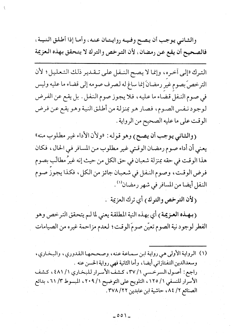 الترك إلى آخره، وإنما لا يصح النفل على تقدير ذلك التعليل؛ لأن الترخص بصوم غير رمضان إنما ساغ له لصرف صومه إلى قضاء ما عليه وليس في صوم النقل قضاء ما عليه، فلا يجوز صوم النفل. بل يقع عن الفرض لوجود نفس الصوم، فصار هو بمنزلة من أطلق النية وهو يقع عن فرض الوقت على ما عليه الصحيح من الرواية.