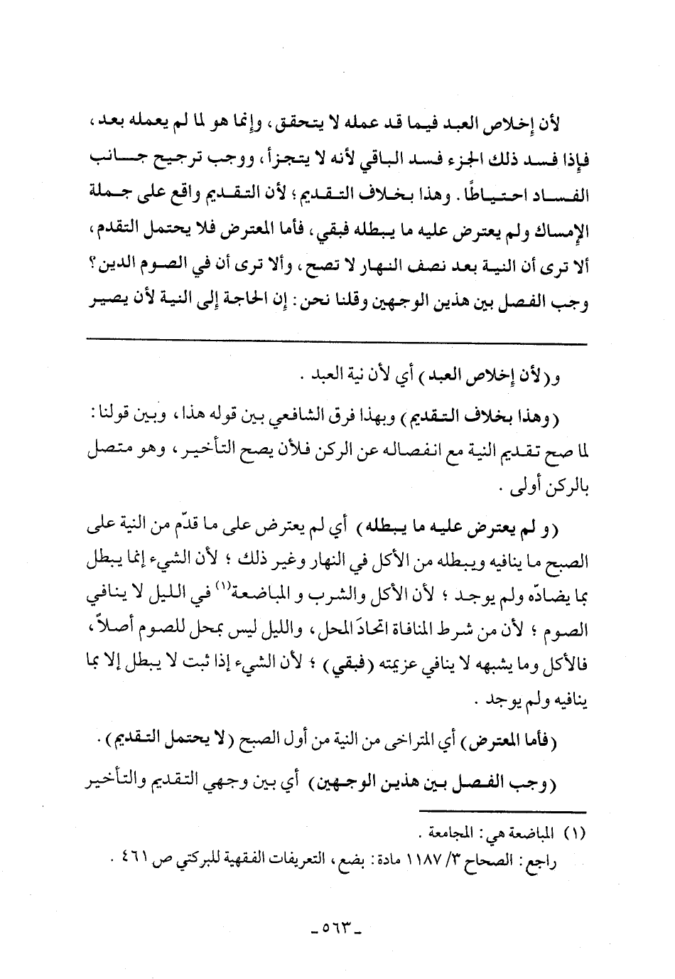 (ولم يعترض عليه ما يبطله) أي لم يعترض على ما قدّم من النية على الصبح ما ينافيه ويبطله من الأكل في النهار وغير ذلك؛ لأن الشيء إنما يبطل بما يضادّه ولم يوجد؛ لأن الأكل والشرب والمباضعة في الليل لا ينافي الصوم؛ لأن من شرط المنافاة اتحادَ المحل، والليل ليس بمحل للصوم أصلًا، فالأكل وما يشبهه لا ينافي عزيمته (فبقي)؛ لان الشيء إذا ثبت لا يبطل إلا بما ينافيه ولم يوجد.