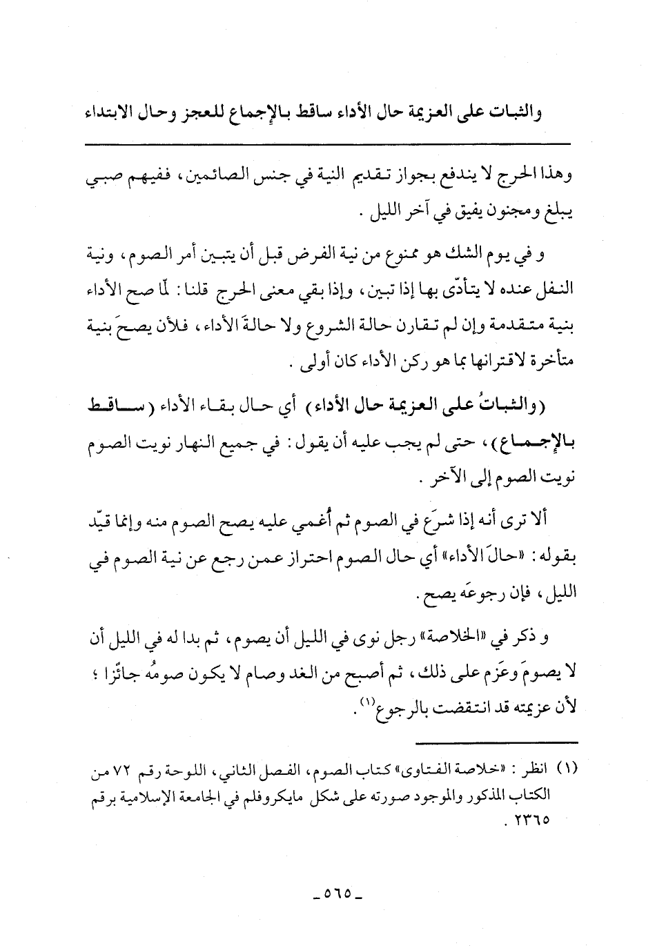 (والثبات على العزيمة حال الأداء) أي حال بقاء الأداء (ساقط بالإجماع)، حتى لم يجب عليه أن يقول: في جميع النهار نويت الصوم نويت الصوم إلى الآخر.
