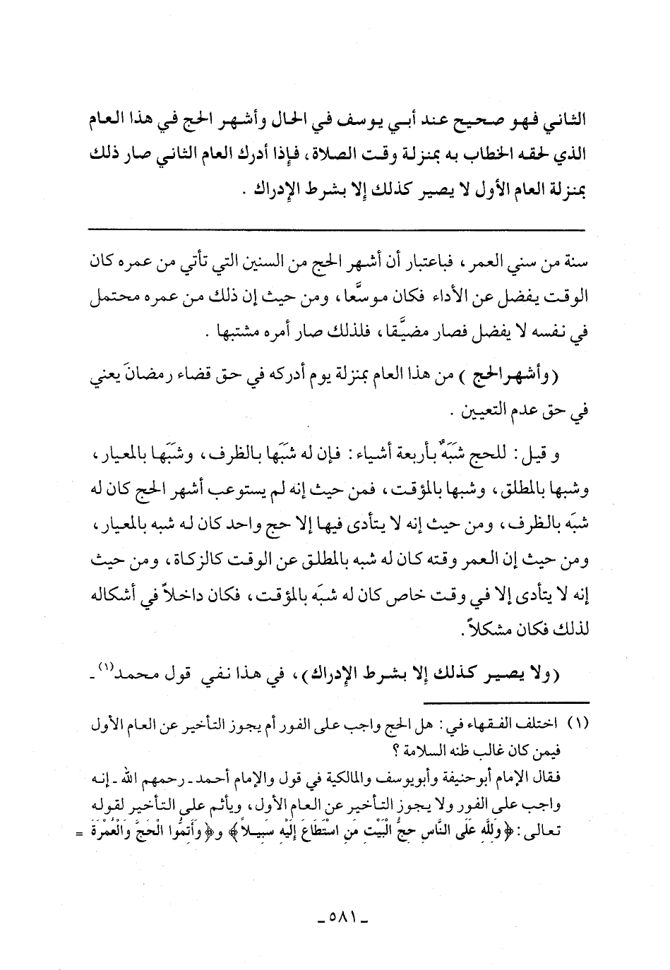 سنة من سني العمر، فباعتبار أن أشهر الحج من السنين التي تأتي من عمره كان الوقت يفضل عن الأداء فكان موسعًا، ومن حيث إن ذلك من عمره محتمل في نفسه لا يفضل فصار مضيقًا، فلذلك صار أمره مشتبهًا.