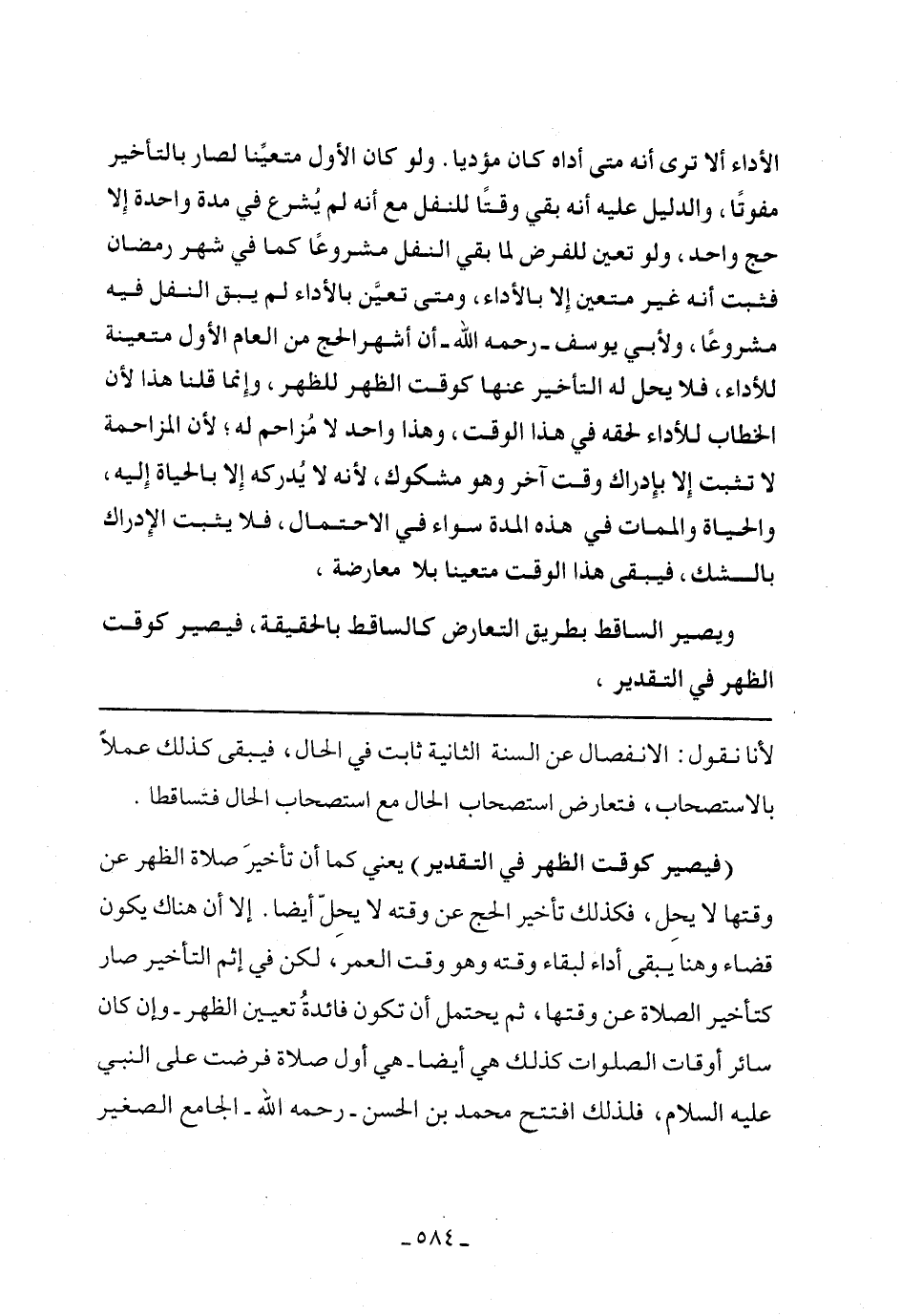(فيصير كوقت الظهر في التقدير) يعني كما أن تأخير صلاة الظهر عن وقتها لا يحل، فكذلك تأخير الحج عن وقته لا يحل أيضًا. إلا أن هناك يكون قضاء وهنا يبقى أداء لبقاء وقته وهو وقت العمر، لكن في إثم التأخير صار كتأخير الصلاة عن وقتها، ثم يحتمل أن تكون فائدة تعيين الظهر- وإن كان سائر أوقات الصلوات كذلك هي أيضًا- هي أول صلاة فرضت على النبي عليه الصلاة والسلام، فلذلك افتتح محمد بن الحسن- رحمه الله- الجامع الصغير