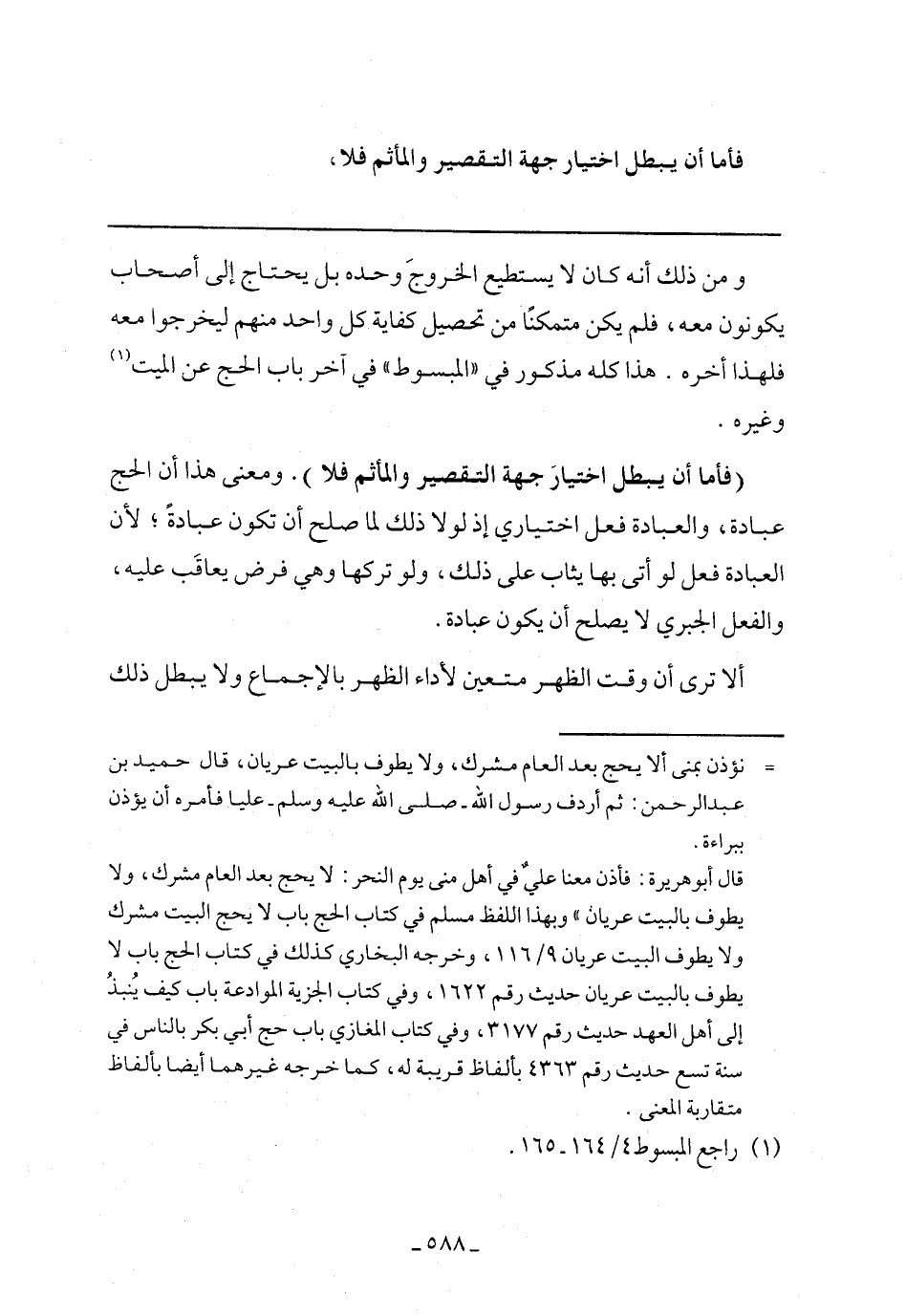 (فأما أن يبطل اختيار جهة التقصير والمأثم فلا). ومعنى هذا أن الحج عبادة، والعبادة فعل اختياري إذ لولا ذلك لما صلح أن تكون عبادة؛ لأن العبادة فعل لو أتى بها يثاب على ذلكن ولو تركنها وهي فرض يعاقب عليه، والفعل الجبري لا يصلح أن يكون عبادة.