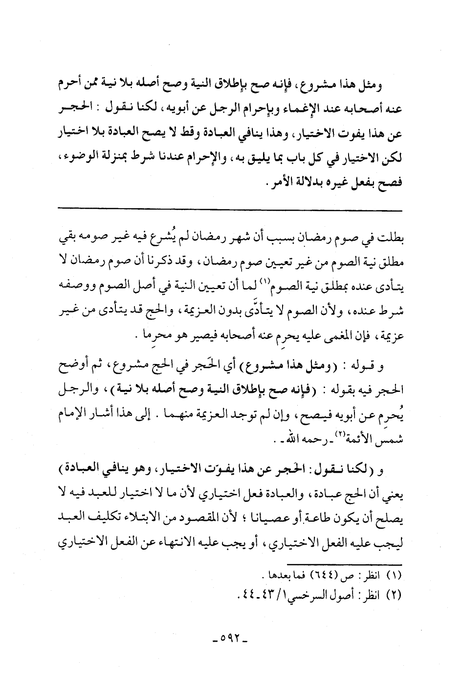 وقوله: (ومثل هذا مشروع) أي الحجر في الحج مشروع، ثم أوضح الحجر فيه بقوله: (فإنه صح بإطلاق النية وصح أصله بلا نية)، والرجل يحرم عن أبويه فيصح، وإن لم توجد العزيمة منهما. إلى هذا أشار الإمام شمس الأئمة- رحمه الله-.