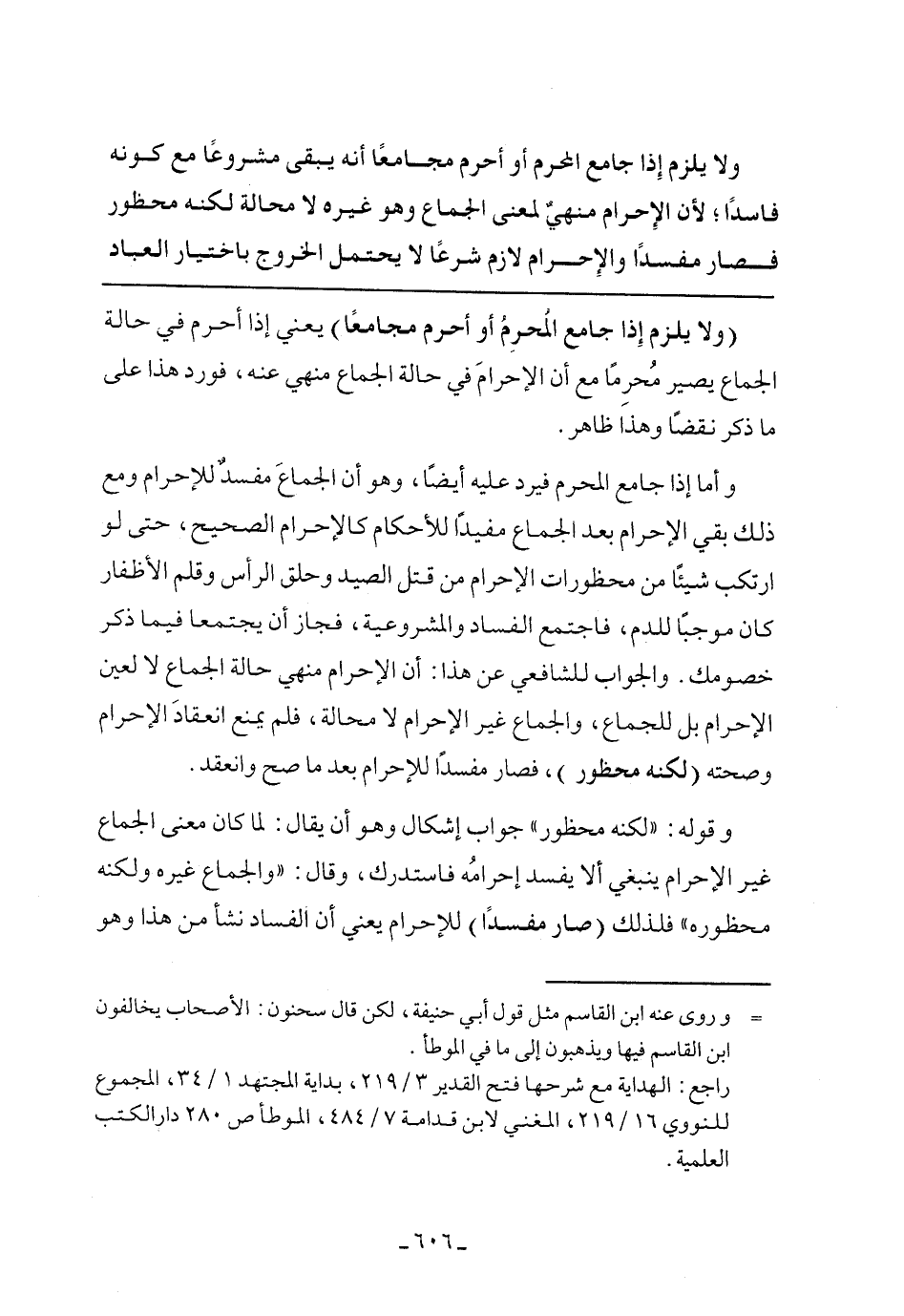 وأما إذا جامع المحرم فيرد عليه أيضًا، وهو أن الجماع مفسد للإحرام ومع ذلك بقي الإحرام بعد الجماع مفيدًا للأحكام كالإحرام الصحيح، حتى لو ارتكب شيئًا من محظورات الإحرام من قتل الصيد وحلق الرأس وقلم الأظفار كان موجبًا للدم، فاجتمع الفساد والمشروعية، فجاز أن يجتمعا فيما ذكر خصومك. والجواب للشافعي عن هذا: أن الإحرام منهي حالة الجماع لا لعين الإحرام بل للجماع، والجماع غير الإحرام لا محالة، فلم يمنع انعقاد الإحرام وصحته (لكنه محظور)، فصار مفسدًا للإحرام بعد ما صح وانعقد.