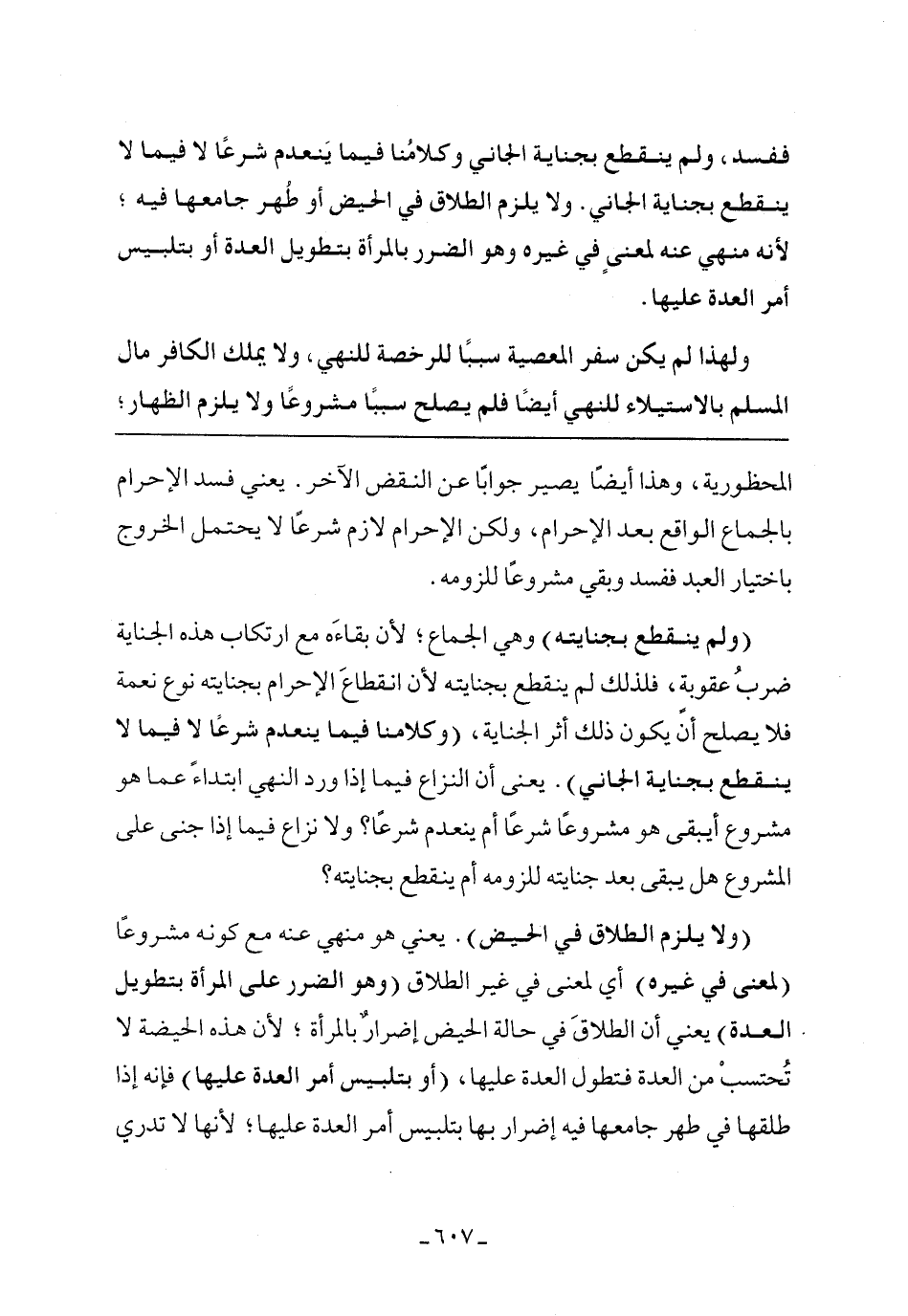 (ولا يلزم الطلاق في الحيض). يعني هو منهي عنه مع كونه مشروعًا (لمعنى في غيره) أي لمعنى في غير الطلاق (وهو الضرر على المرأة بتطويل العدة) يعني أن الطلاق في حالة الحيض إضرار بالمرأة؛ لأن هذه الحيضة لا تحتسب من العدة فتطول العدة عليها، (أو بتلبيس أمر العدة عليها) فإنه إذا طلقها في طهر جامعها فيه إضرار بها بتلبيس أمر العدة عليها؛ لأنها لا تدري