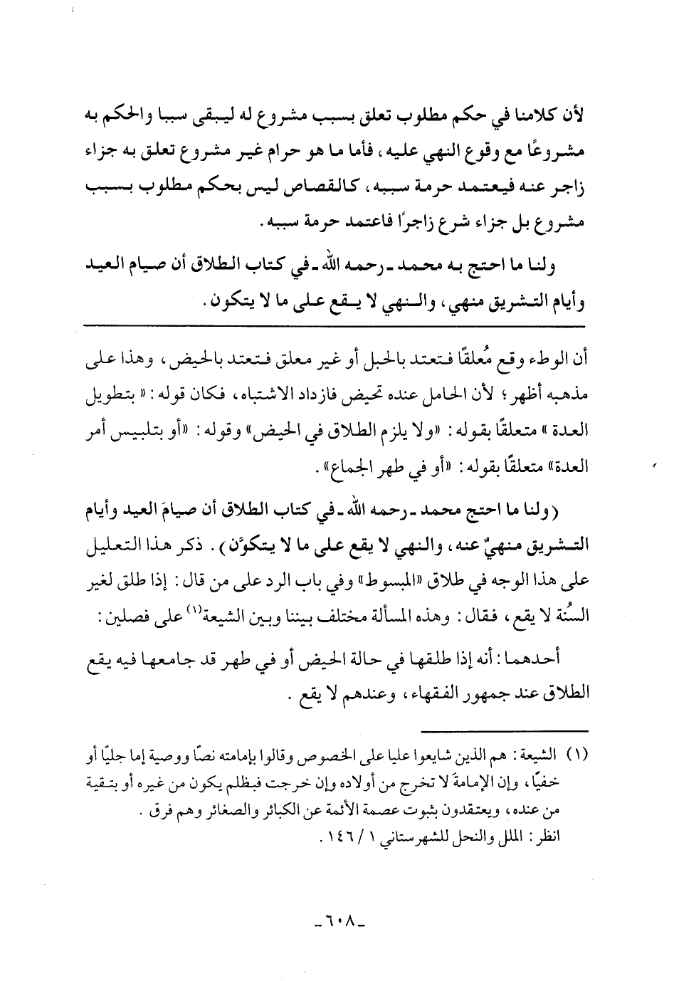 (ولنا ما احتج محمد-رحمه الله- في كتاب الطلاق أن صيام العيد وأيام التشريق منهي عنه، والنهي لا يقع على ما لا يتكون). ذكر هذا التعليل على هذا الوجه في طلاق (المبسوط) وفي باب الرد على من قال: إذا طلق لغير السنة لا يقع، فقال: وهذه المسألة مختلف بيننا وبين الشيعة على فصلين: