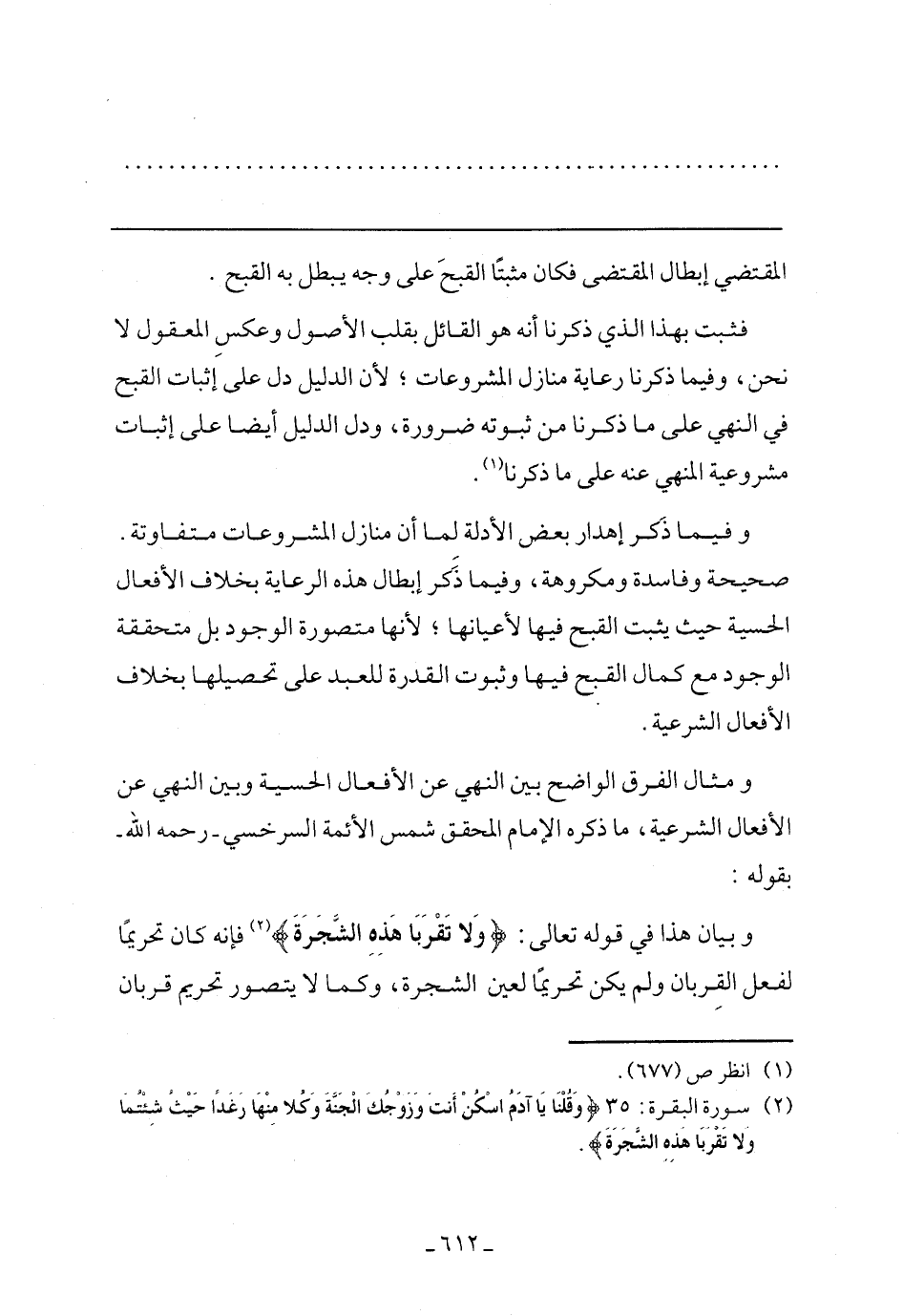 وفيما ذكر إهدار بعض الأدلة لما أن منازل المشروعات متفاوتة. صحيحة وفاسدة ومكروهة، وفيما ذكر إبطال هذه الرعاية بخلاف الأفعال الحسية حيث يثبت القبح فيها لأعيانها؛ لأنها متصورة الوجود بل متحققة الوجود مع كمال القبح فيها وثبوت القدرة للعبد على تحصيلها بخلاف الأفعال الشرعية.
